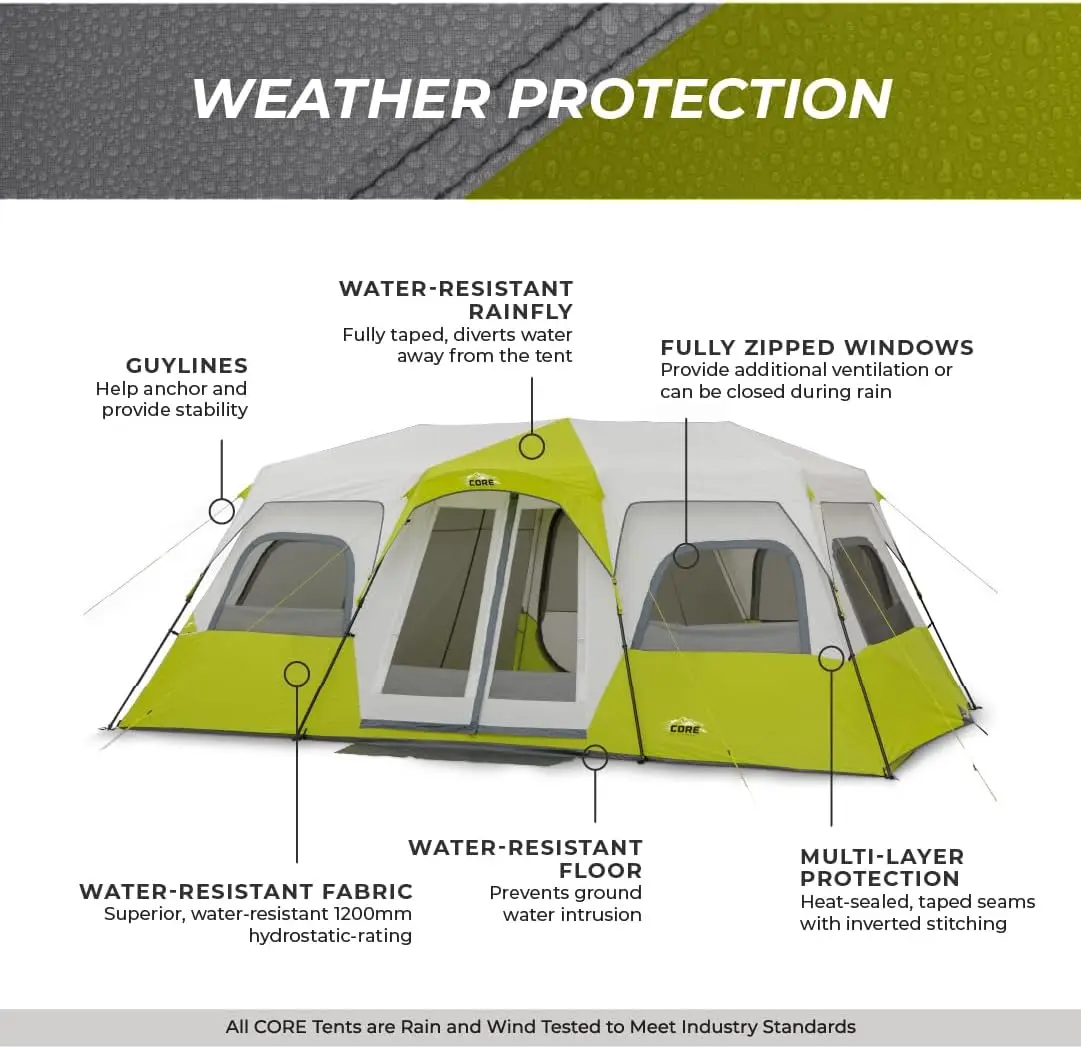 - Sleeping Capacity: Measures 18x10 feet with an 80-inch center height; fits three queen-size air beds; accommodates up to 12 people without gear or 6 people with gear