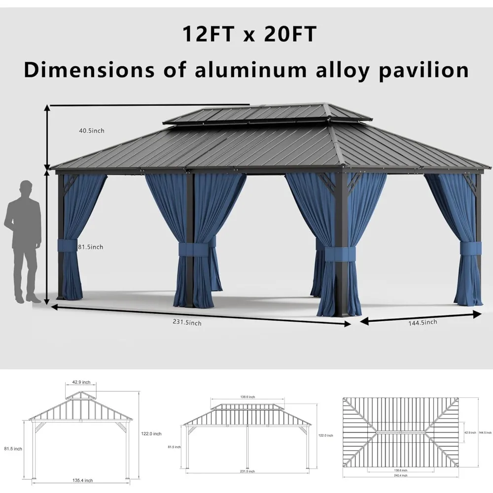 12x20ft Hardtop Gazebo Double Roof, Outdoor Pavilion with 2-Layer Hard top Galvanized Iron Frame Garden Tent