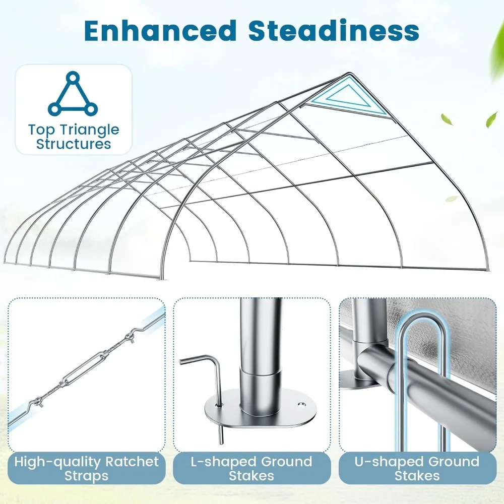 This event tent is crafted from solid galvanized steel tubes and 170g PE fabric for long-lasting use. With easy-to-access zipper doors and adjustable window covers, the outdoor canopy tent offers a comfortable space for up to 90 guests. More importantly, the ground stakes make this tent stand sturdy and secure. Meanwhile, the triangular structures and ratchet straps increase the overall stability. Featuring a peach-shaped design, this wedding tent adds a touch of sophistication to weddings, gatherings, or more events.