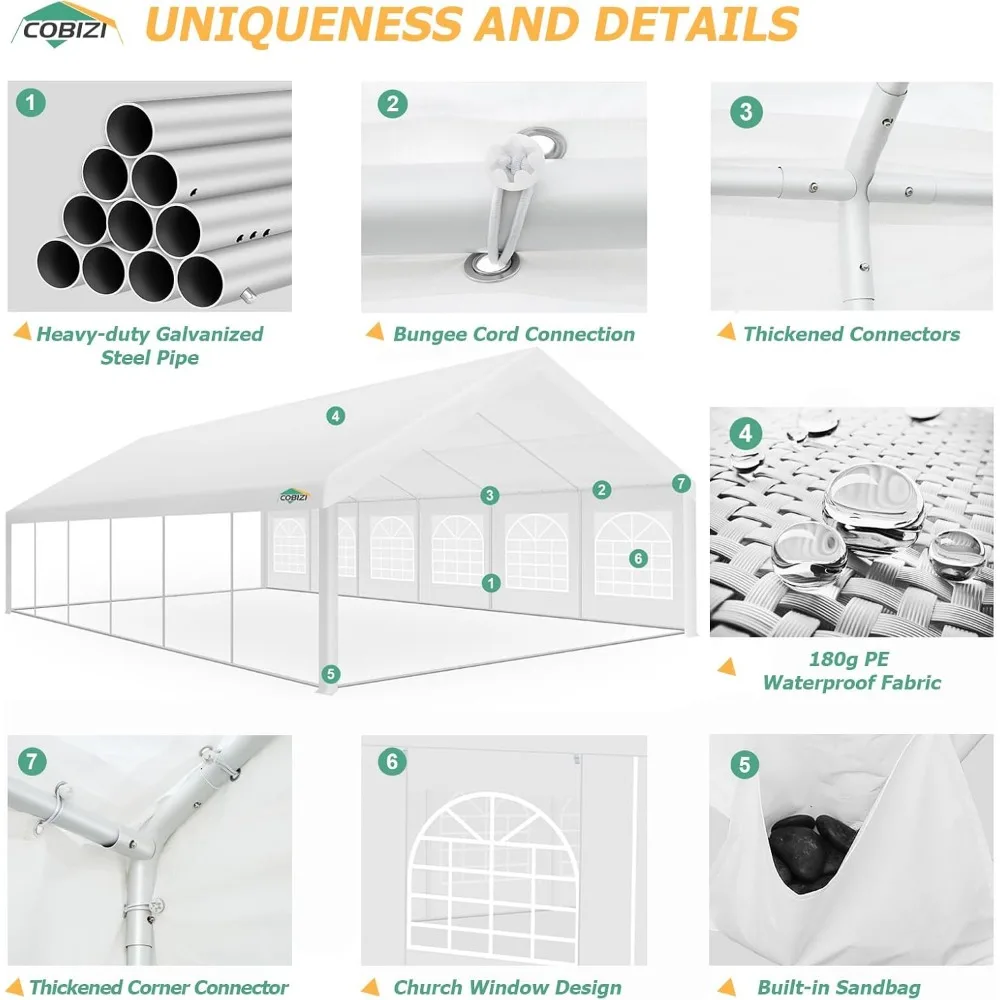 【Premium Construction Material】Top cover of our white tent is made of 160g imported PE fabric, providing waterproof and UV protection.Our 20x40 Heavy Duty Canopy Tent is designed with 6 removable sidewalls and 2 zippered doors with chapel-designed windows that provide excellent cross ventilation and airflow, ensuring you have a cool and comfortable experience. Removable sidewalls also help you make special conditions for different occassions.