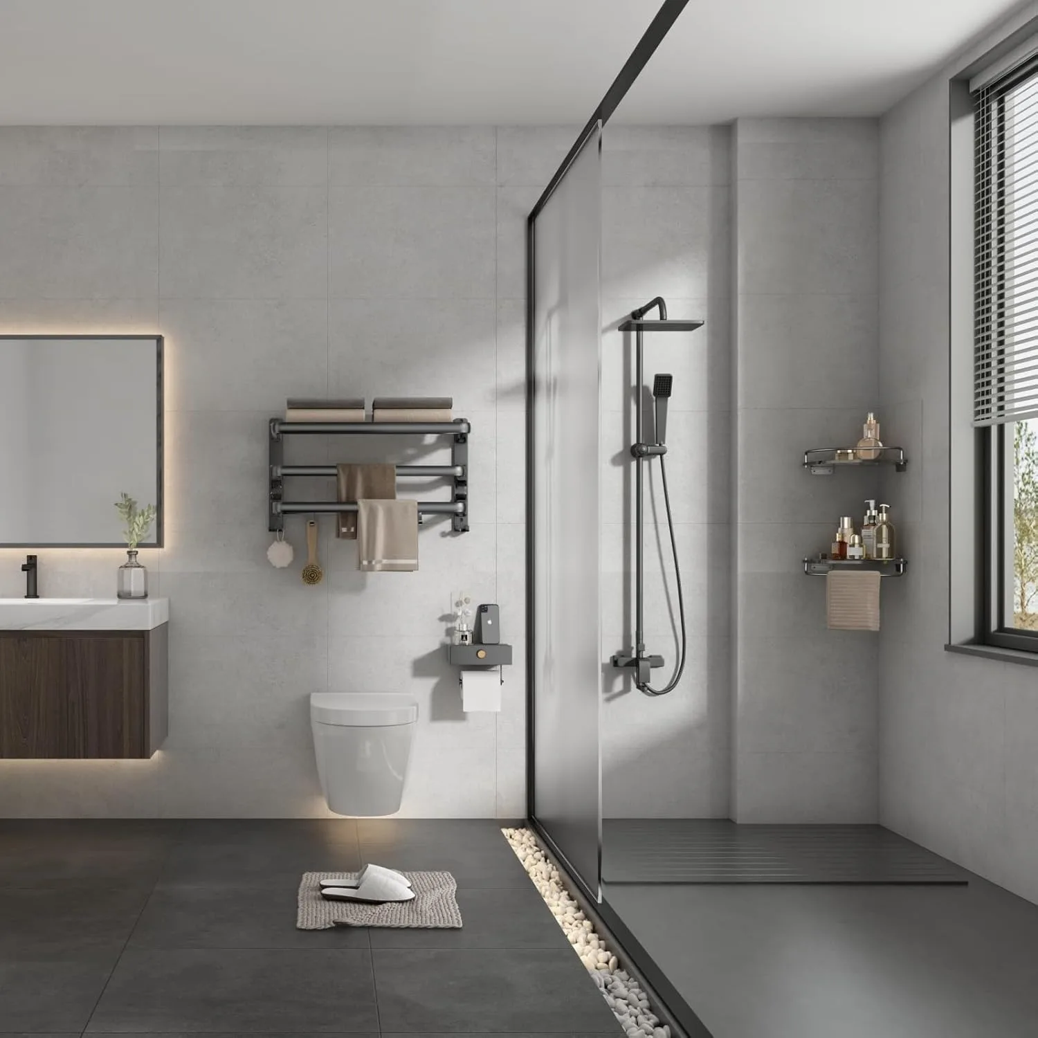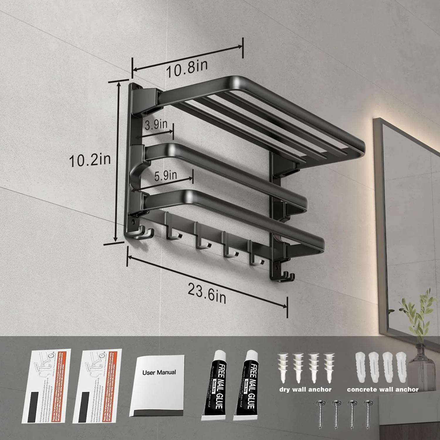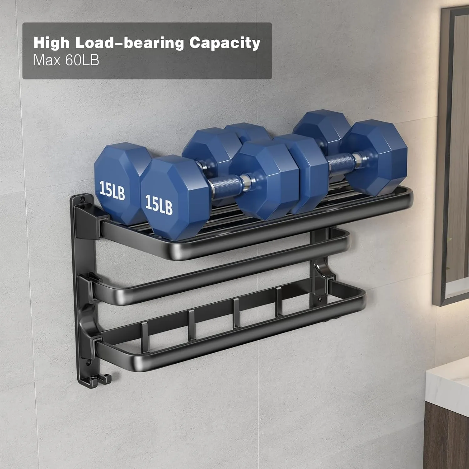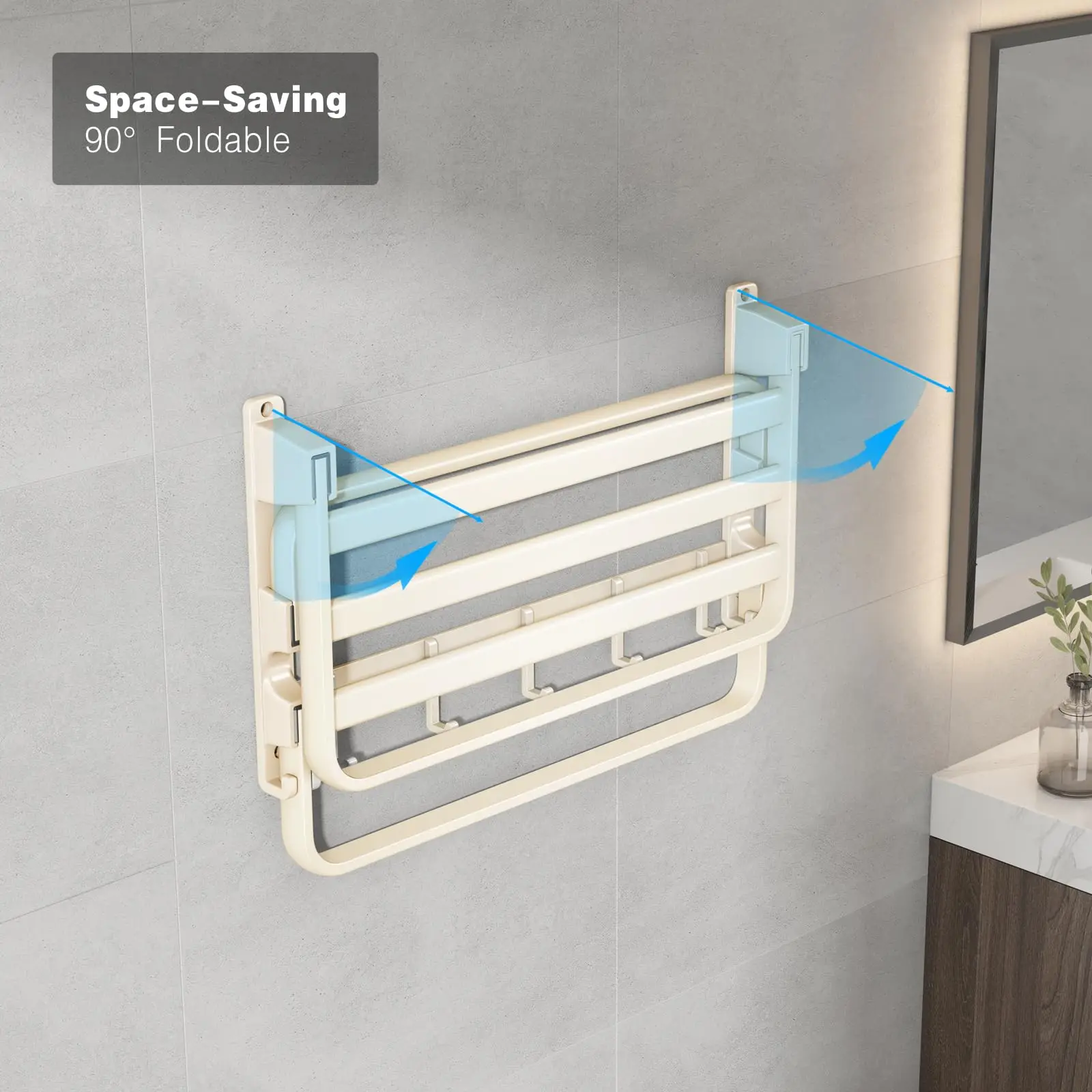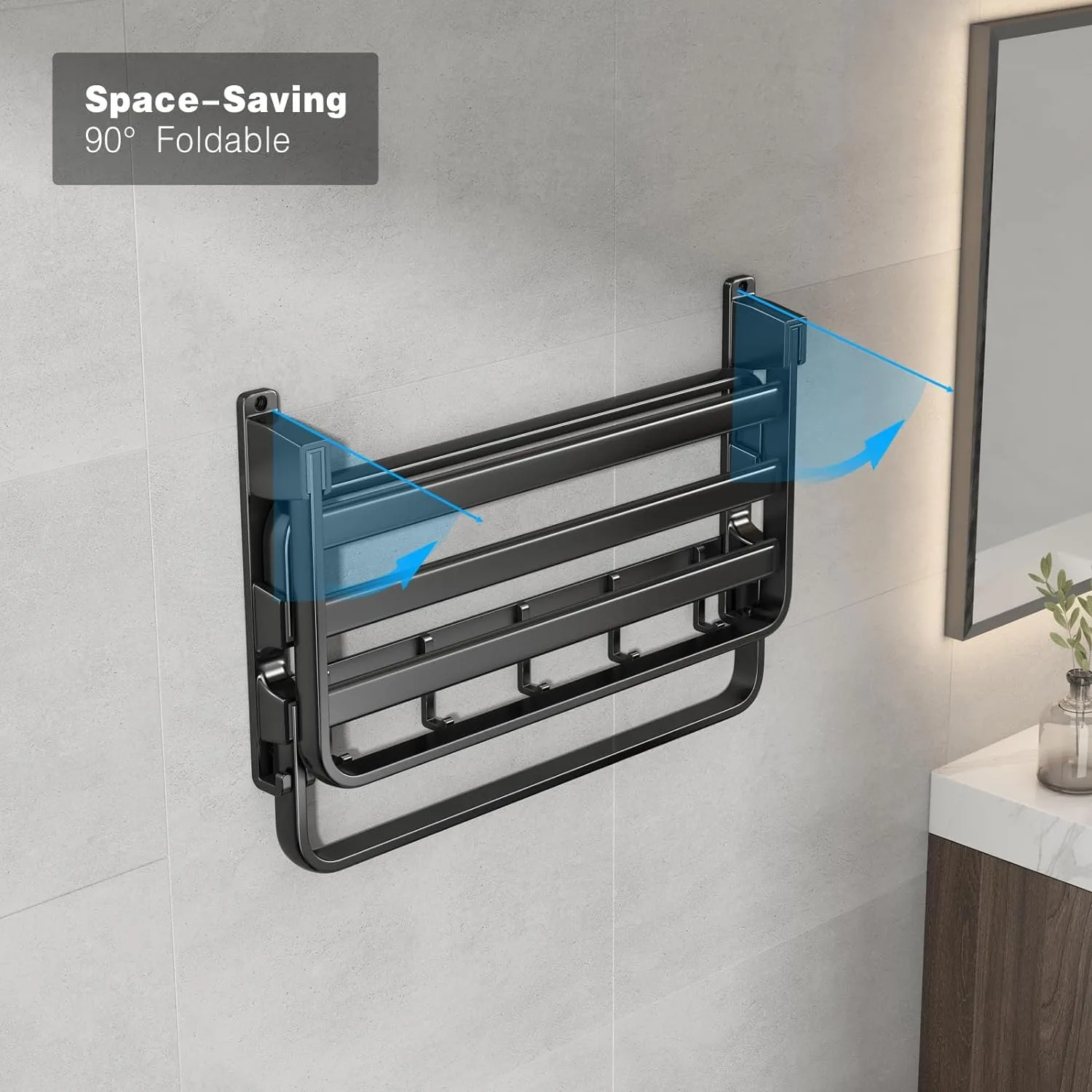 24-Inch Towel Rack,Bathroom Towel Shelf with 2 Towel Bar Foldable Towel Holder with 7 Hooks Towel Storage