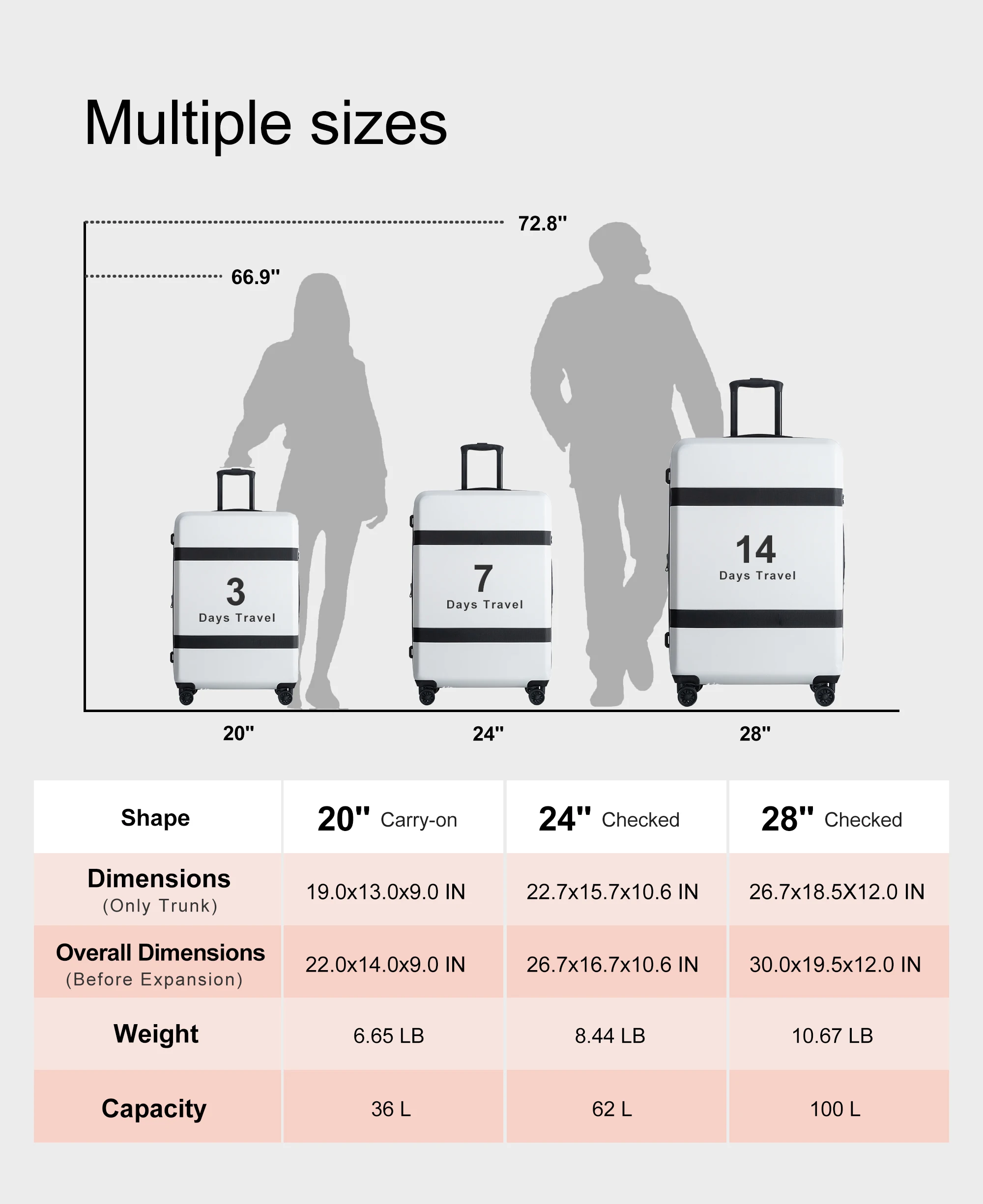 3 Sizes for Flexibility: This set includes three suitcases—20-inch, 24-inch, and 28-inch—perfect for any trip. Whether it’s a short business trip or a long vacation, you can choose the right size for your needs.