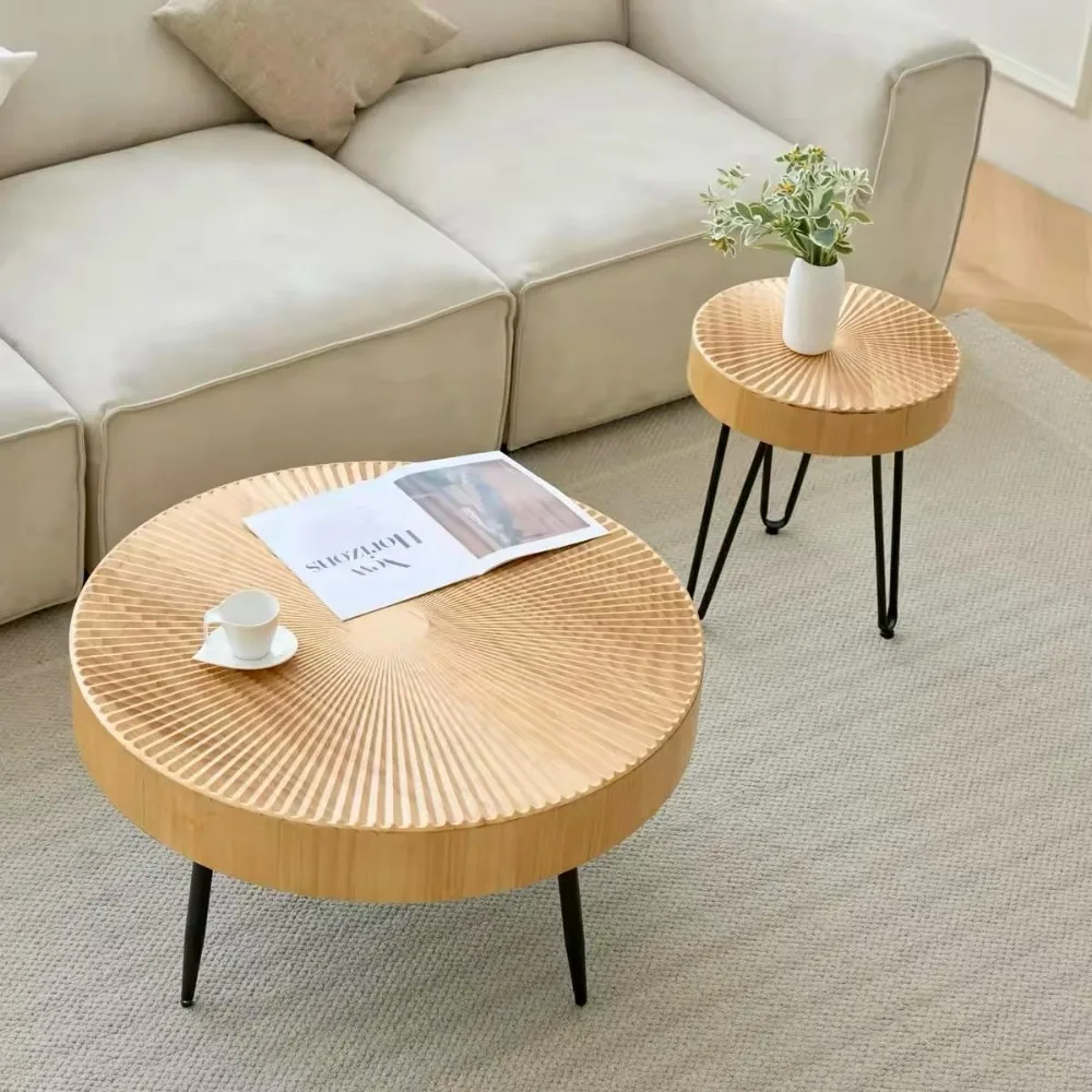 - Natural Wood Coffee Table: This round coffee table features a faux vintage wood radial-shaped patterned tabletop paired with black metal legs, instantly revitalizing your living space. It is suitable for modern farmhouse or vintage-style decor. The small table nests perfectly within the large table, giving you the flexibility to create a layout that suits your unique style and space.
