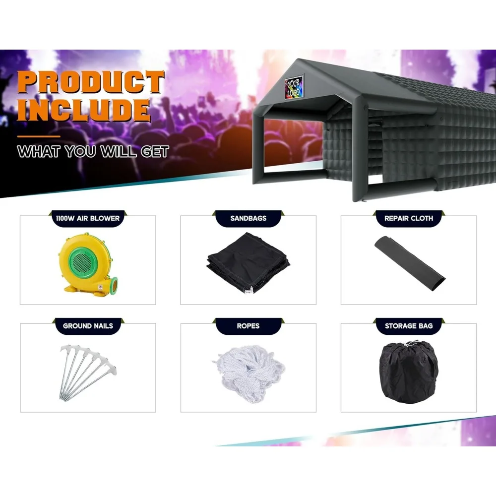 Easy to Install and Storage: Equiped with 1100W blower, 4 zipper air outlets, just need 3-5 minutes to set up and easily deflated. And you will get D-rings, ropes, ground nails, repair cloth and sandbags to enhance the stability of the inflatable party tent