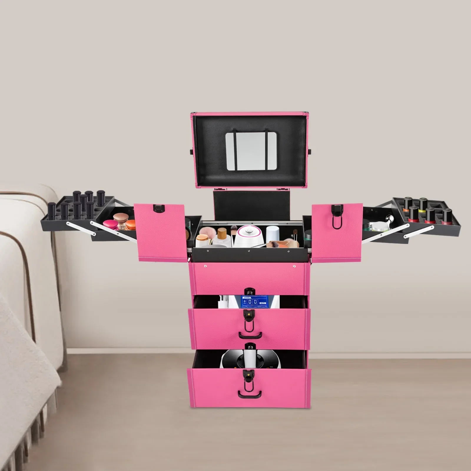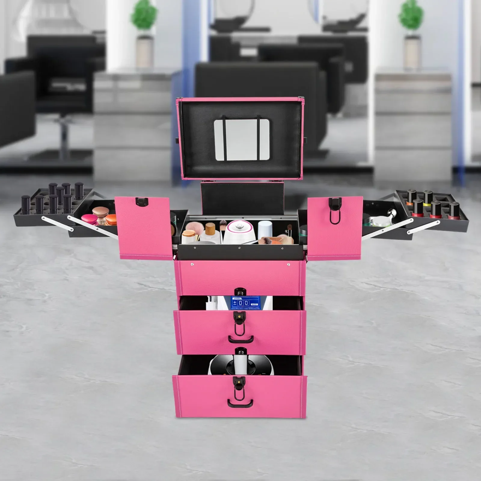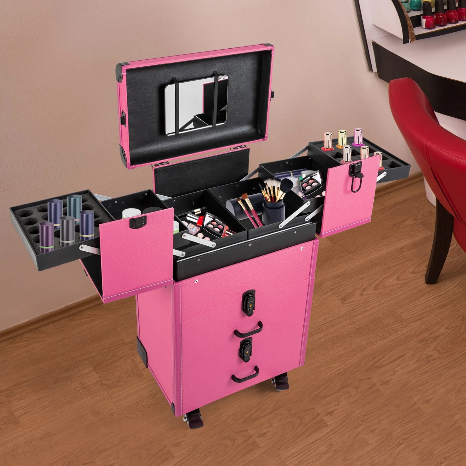 Professional makeup artists, hairdressers, beauticians, manicurists, beauty lovers, etc. can use this product to store cosmetics and makeup tools. It is ideal for makeup contests, wedding makeup scenarios, travel makeup, outdoor shooting, cinemas, dressing rooms, crew, tourism, beauty salons, and more.