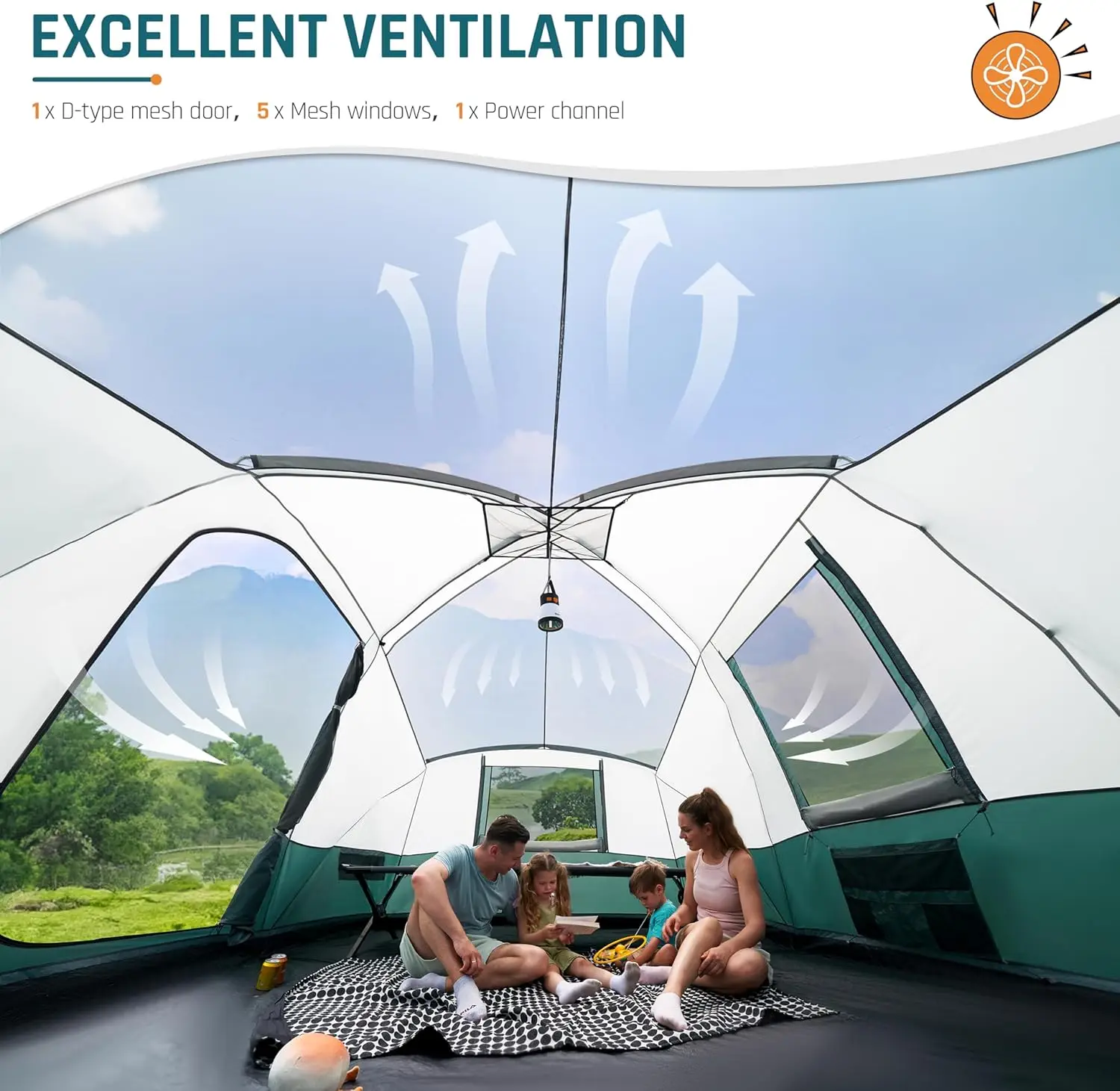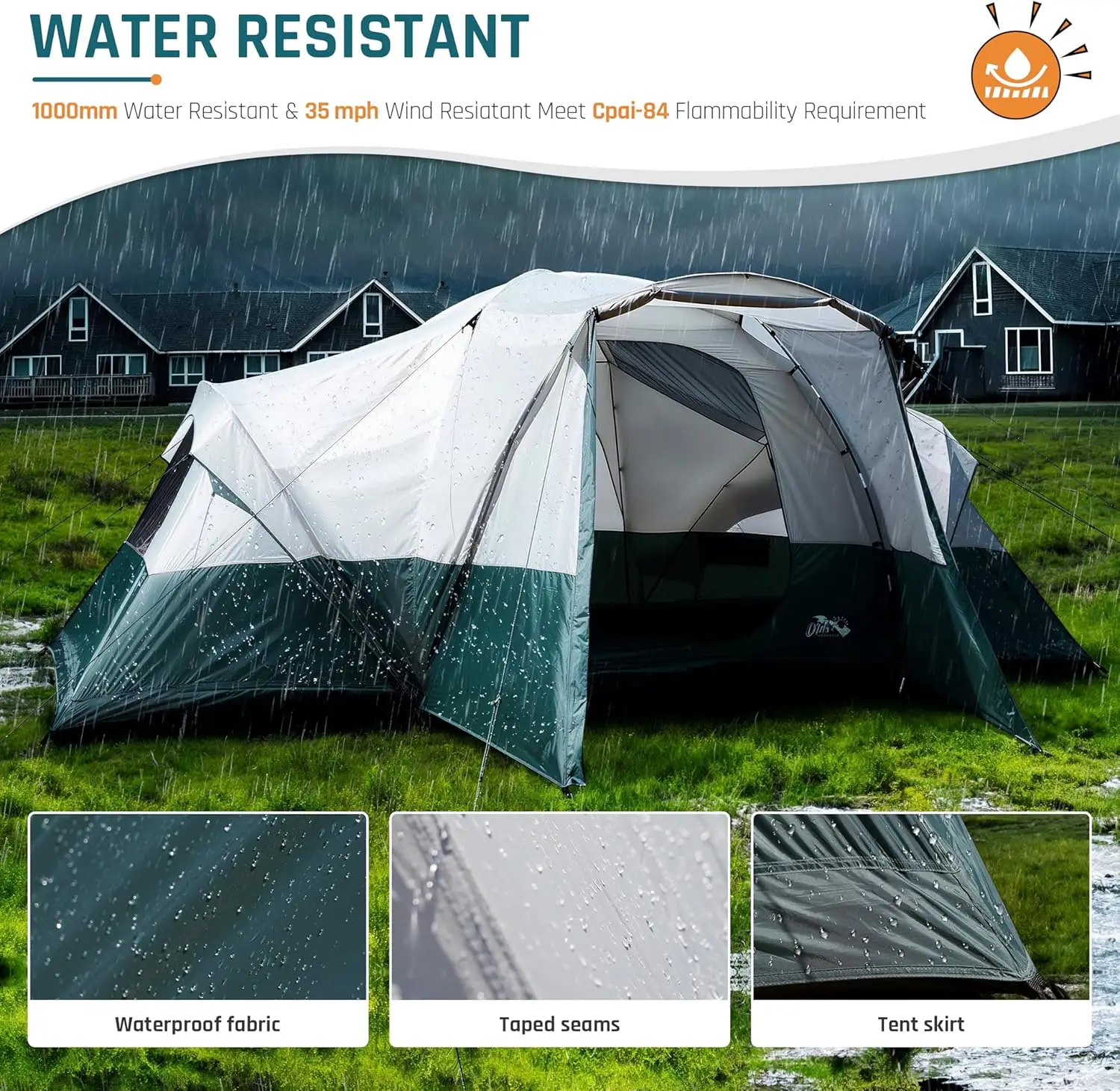 - Spacious Family Tent: Our large tent comfortably sleeps 11 people in a spacious 16 x 10 feet. Pre-curved Overhead fiberglass poles give the tent an impressive 78-inch center height. It's ideal for family camping trips, providing plenty of room for everyone to stretch out and relax.