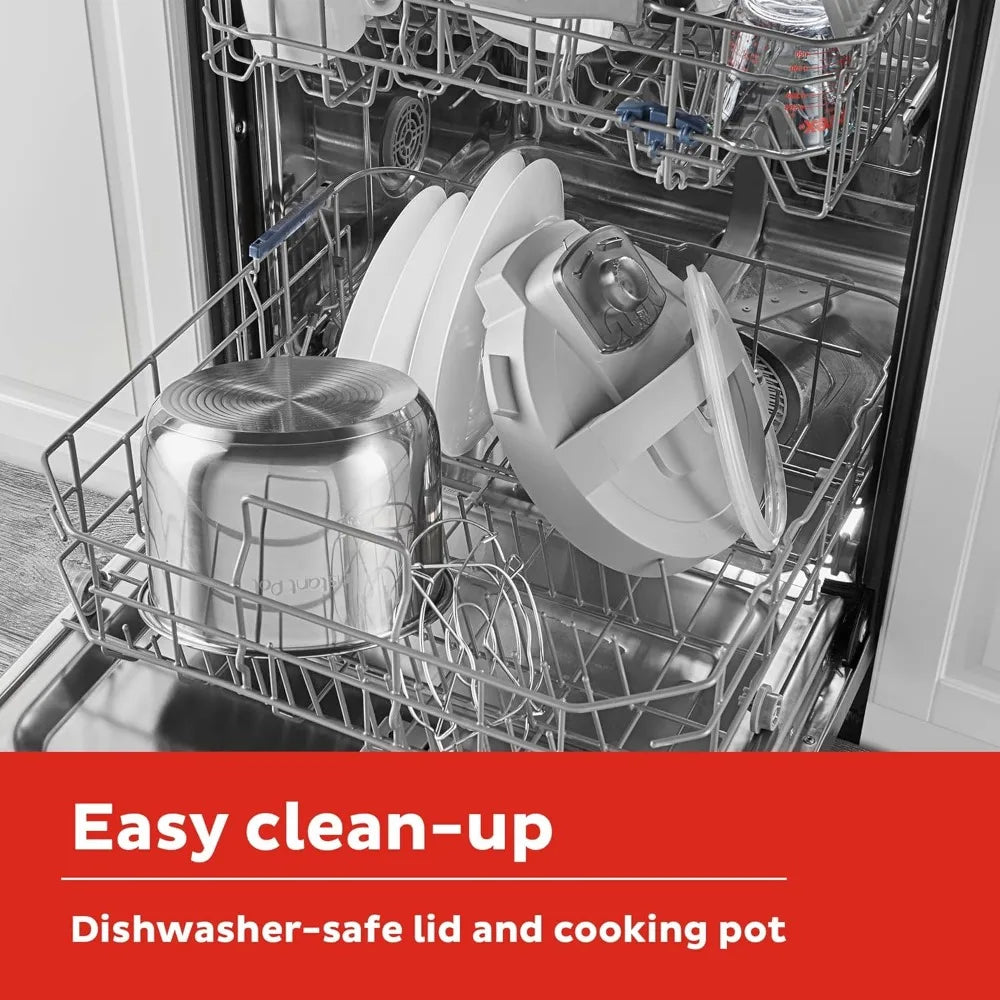 QUICK, EASY CLEAN UP: Finger-print resistant, stainless-steel sides and dishwasher-safe lid, inner pot, and accessories.