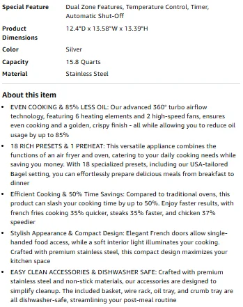 Air Fryer 15.8 Qt,French Door Toaster Oven Combo Compact Countertop Design 1 Light, Easy Clean, Simple Panel,Multi Cooking