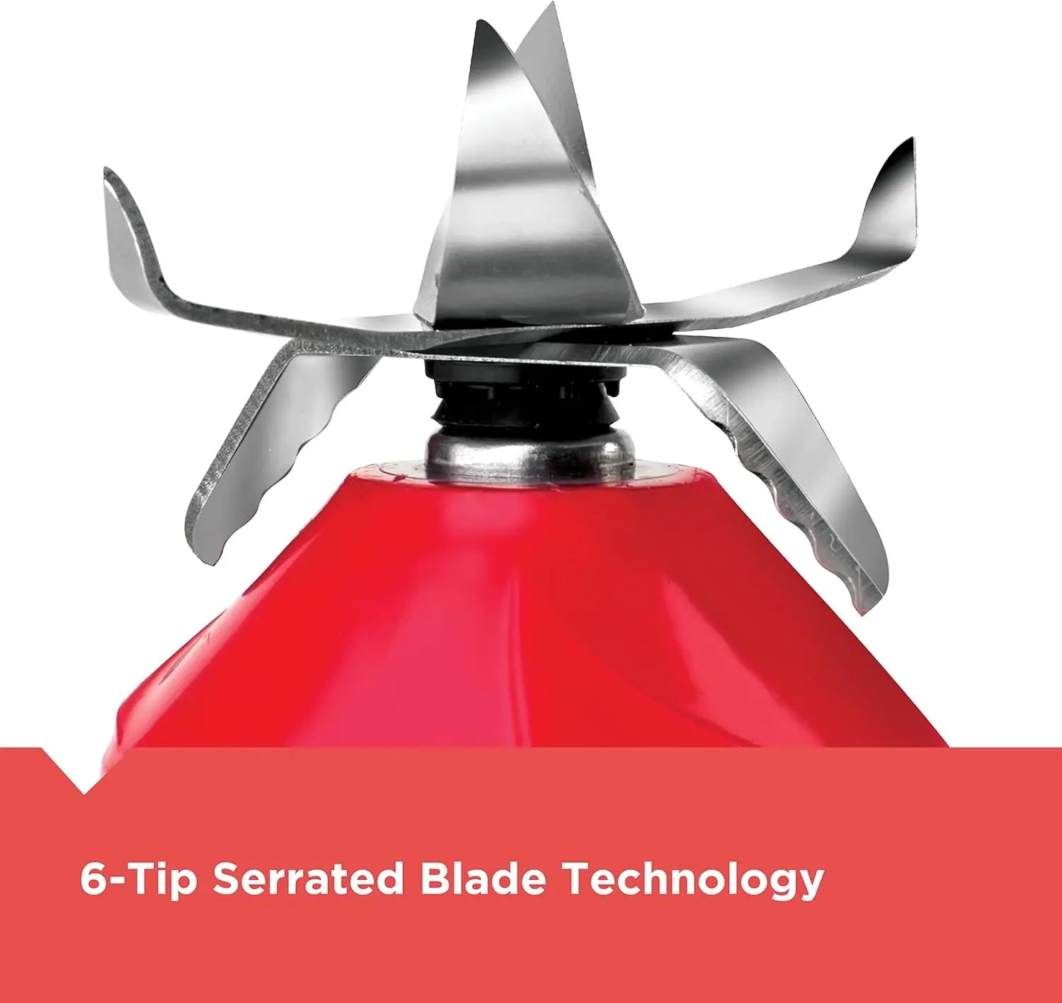 6-TIP SERRATED BLADE TECHNOLOGY - 6-tip serrated blending blade technology works with the shape of the jar to create a constant flow and vortex that leads ingredients directly to the blades for fast blending performance.
