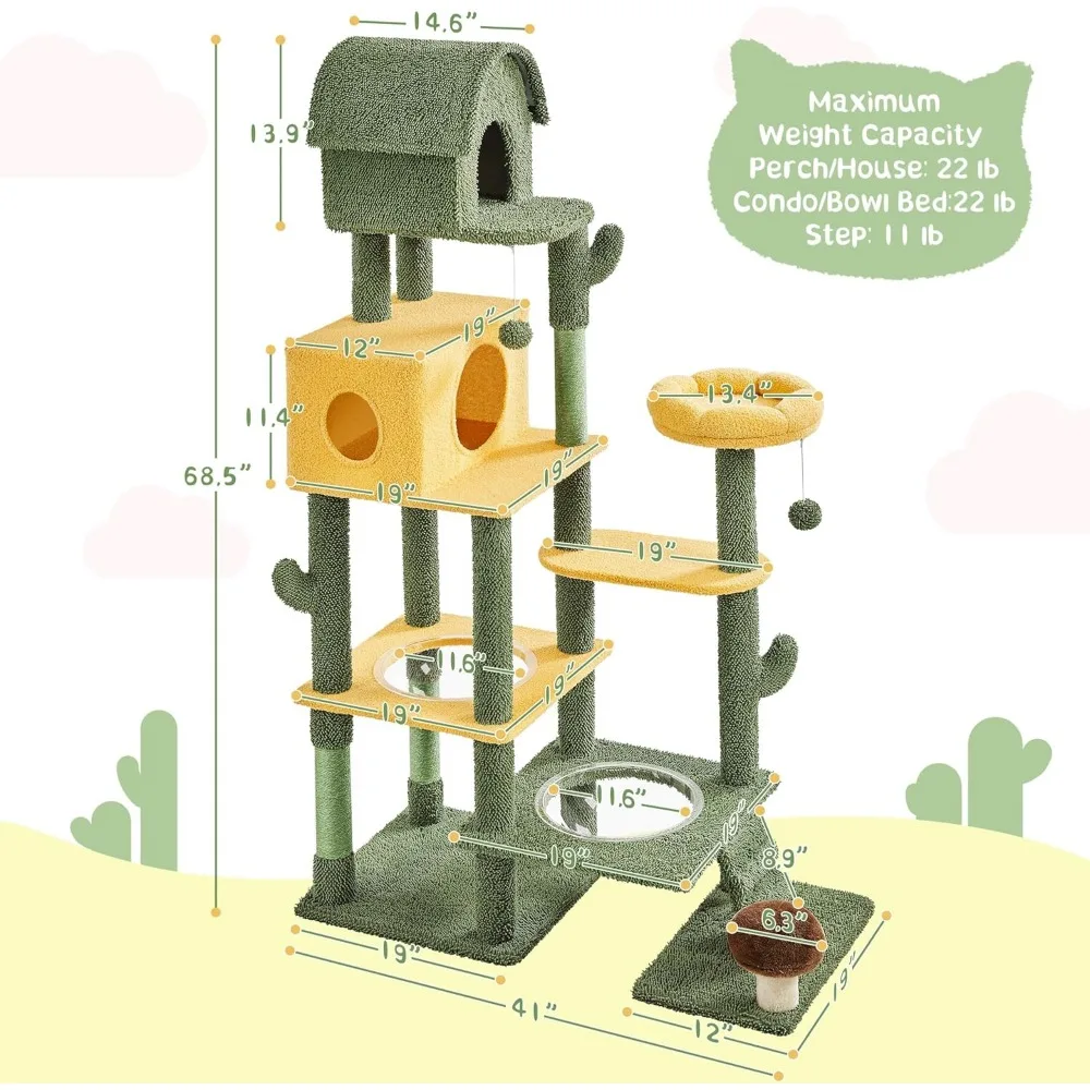 Cactus Cat Tree, Large Cat Tree for Indoor Cats, Multi-Level Cat Tower with 2 Large Condo, Scratching Posts, 2 Acrylic Clear Bowls and Dangling Balls, 68.5in
