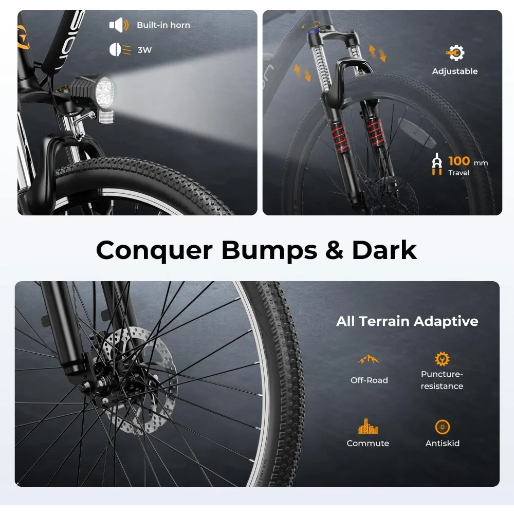 - Riding Comfortably and Handily: The 26" puncture resistant tires are for greater durability. A high-strength front fork suspension, 7-speed gears, dual lights, LCD display, front and rear mechanical disc brakes can bring your riding more comforts, make your e-bike adapted to complex terrains and keep you safe