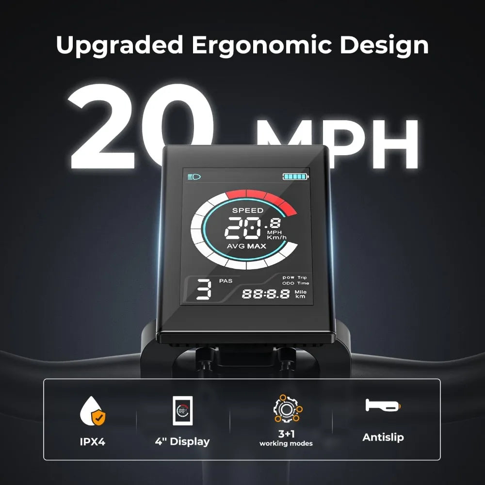 - 350 W Motor & Upgraded Display: The EB5 electric bike equipped with a 500 W peak motor, boosted a top speed of 20 MPH. The display panel has adjustable backlight brightness from 1-5 levels. In addition, the upgraded LCD Display provides riding data support, such as ODO/MAX/AVG SPEED, PAS mode can be customized up to 3 modes