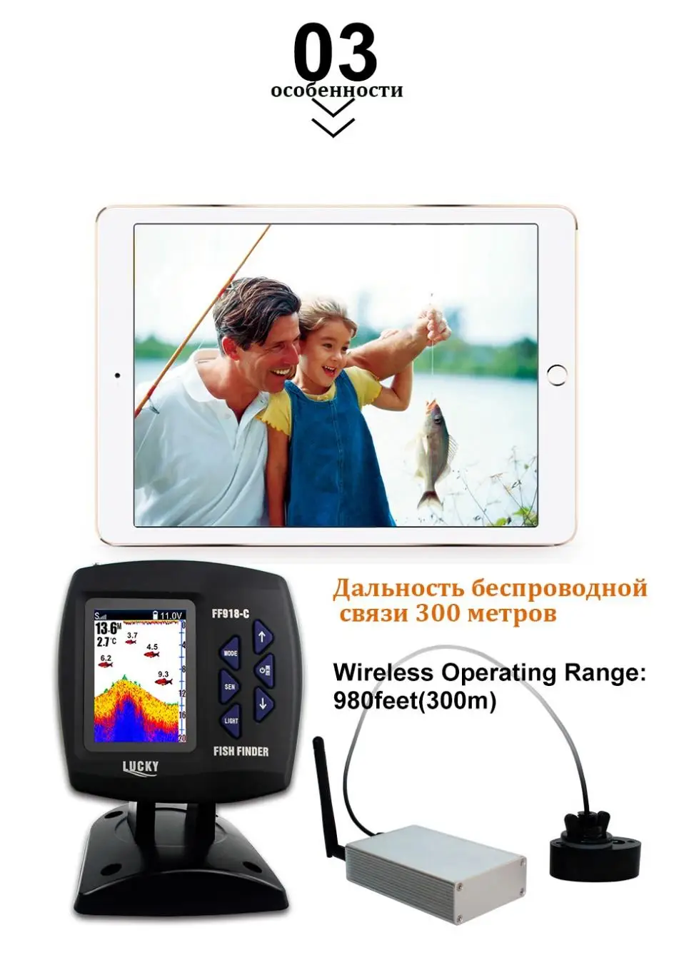 FF918CWLS Wireless Operation Echo Detecting Fish Finder 980 Feet Operating Range 45 Degrees Detecting Camera Detector