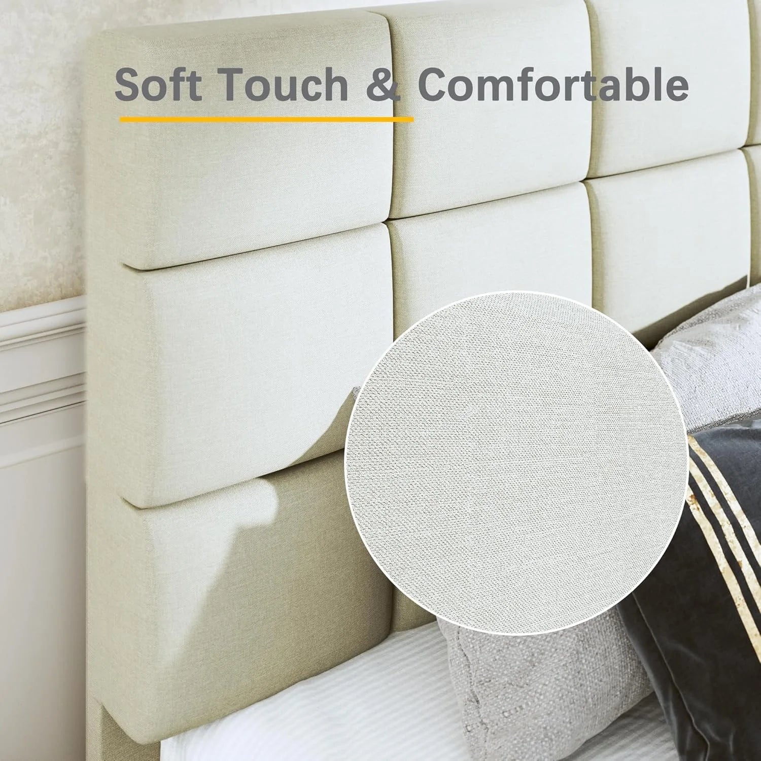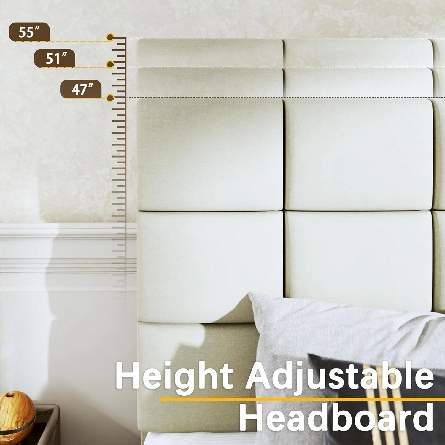Full Bed Frame Upholstered Bed Frame Platform with Adjustable Headboard Linen Fabric Tufted Headboard Wooden Slats Support
