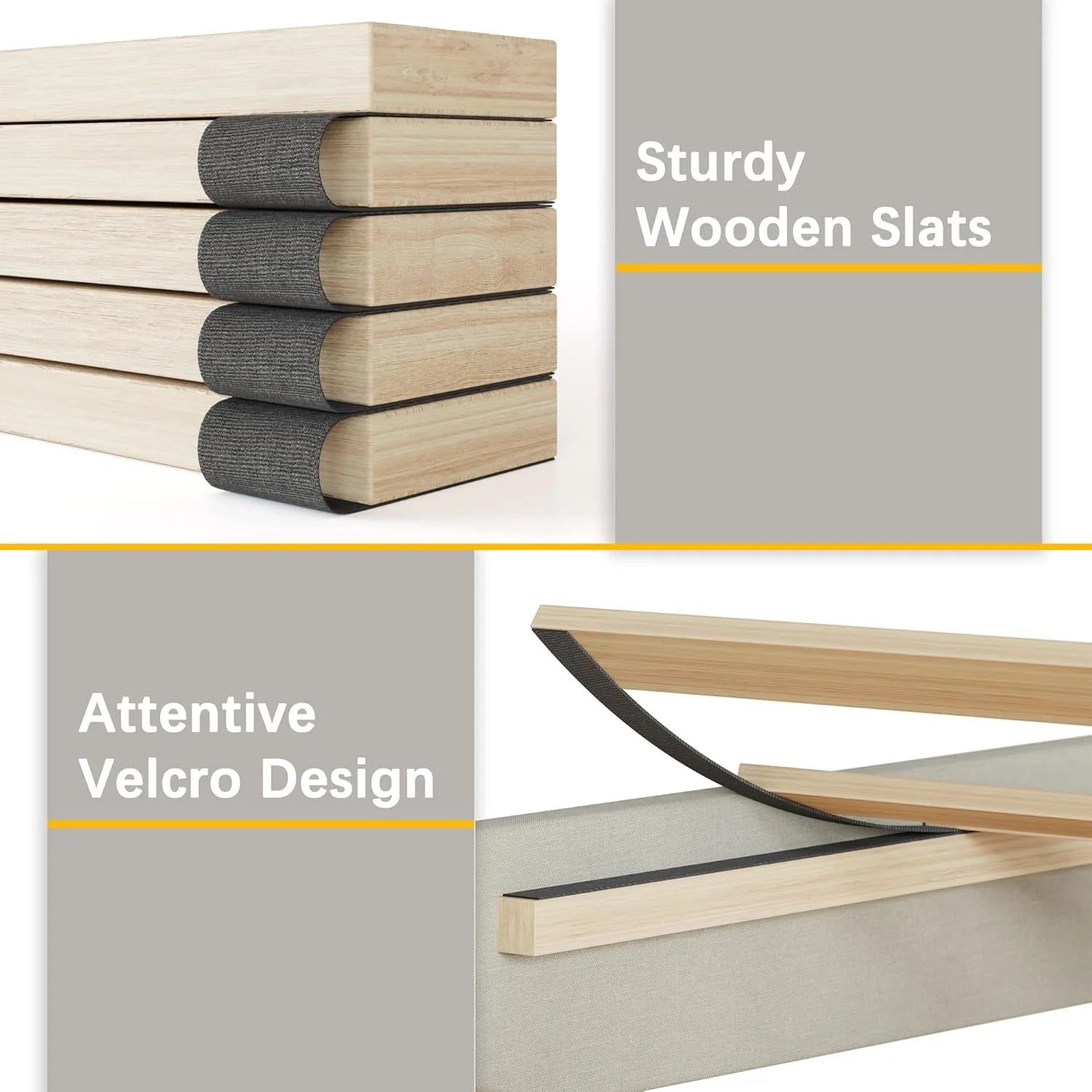 - 【Easily Assemble】In order to reduce the difficulty and save the time of installation, we simplify the installation of the wooden slat system and provide detailed instructions. You just need 1 minute to finish the slat system using the hook&loop slats with velcro design and only need to spend less than 60 minutes to complete the whole bed frame following the instructions.