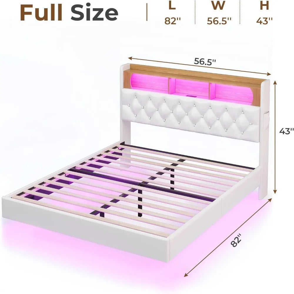 Full Bed Frame with LED Lights & Storage Headboard, Floating Platform Bed with Charging Station, Modern LED Floating Bed