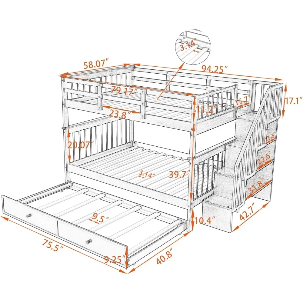 - [High Quality Full Over Full Bunk Bed] - The full bunk bed structure is crafted from high-quality wood, solid pine legs and a strong, durable frame so that the bed is sturdy and durable. functional and aesthetic, this full bunk bed will enhance any bedroom. Weight Capacity:Upper bed - 250LBS,Bottom bed - 300LBS, Trundle:175LB.