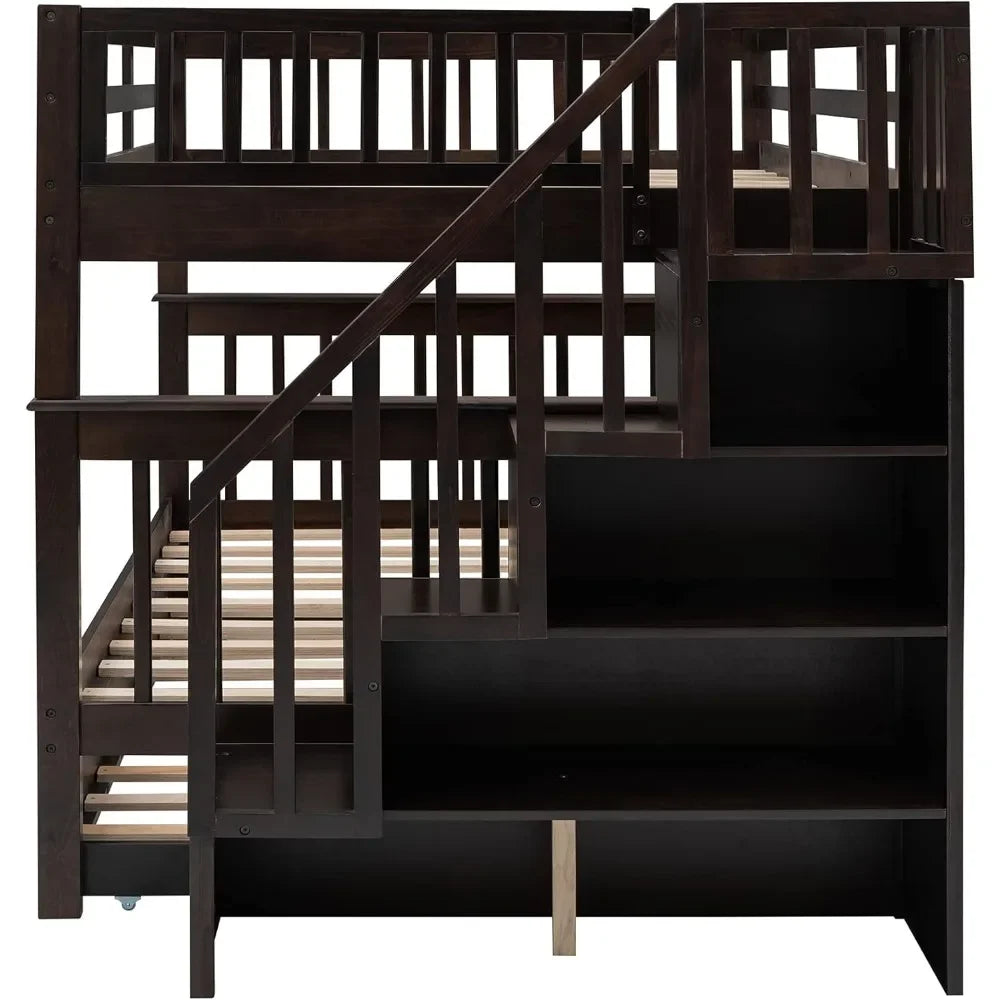 Full Over Full Bunk Bed with Trundle & Stairs, Wooden Full Size Bunk Bed Frame with Storage,for Kids Teens Adults