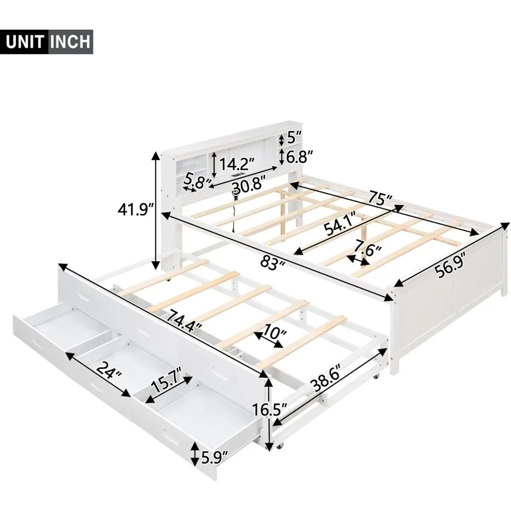 - 【Exquisite Full Size Platform Bed 】Overall Full Bed Dimension : 83''L x 56.9''W x 41.9''H.Coming with the included necessary screw and step-by-step instructions, it is very easy to put the Full bed together. NOTE: This Full bed frame with trundle and storage comes in 2 boxes and may arrived on different dates . Please wait patiently or contact us freely if you only receive part of them.