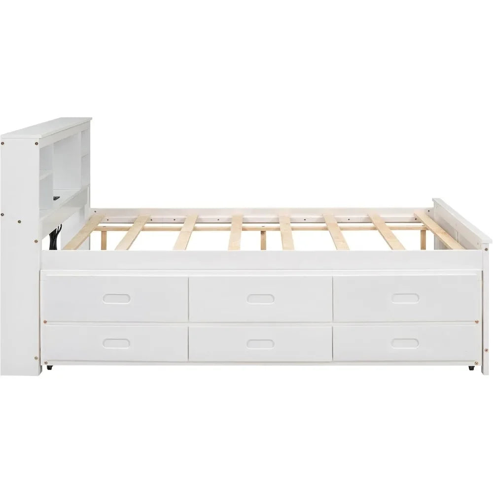 Full Storage Bed With Bookcase Headboard Wood Platform Bed Frames for Kids Teens Adults - White Bedroom Furniture Queen Frame