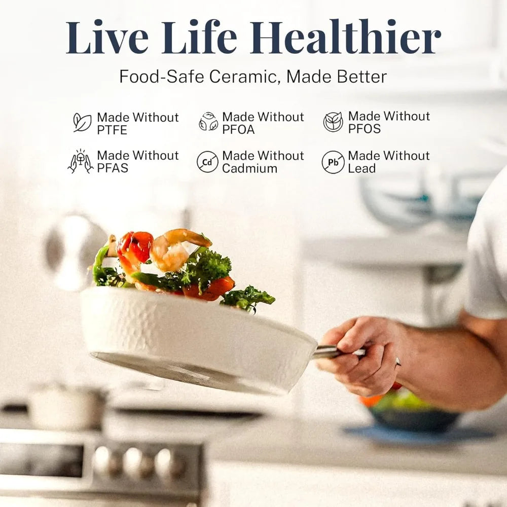 Hammered 15 Pc Ceramic Pots and Pans Set Non Stick Pots and Pan Set Dishwasher Safe Cream White Cookware Kitchen Dining Bar Home