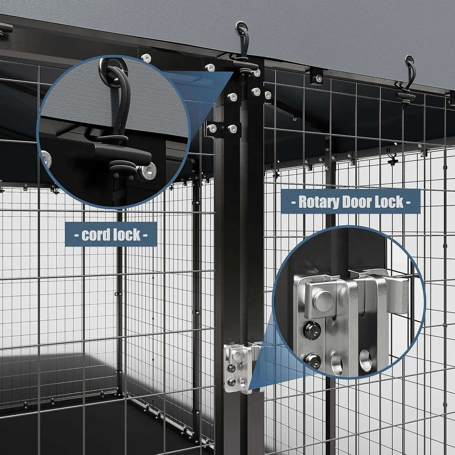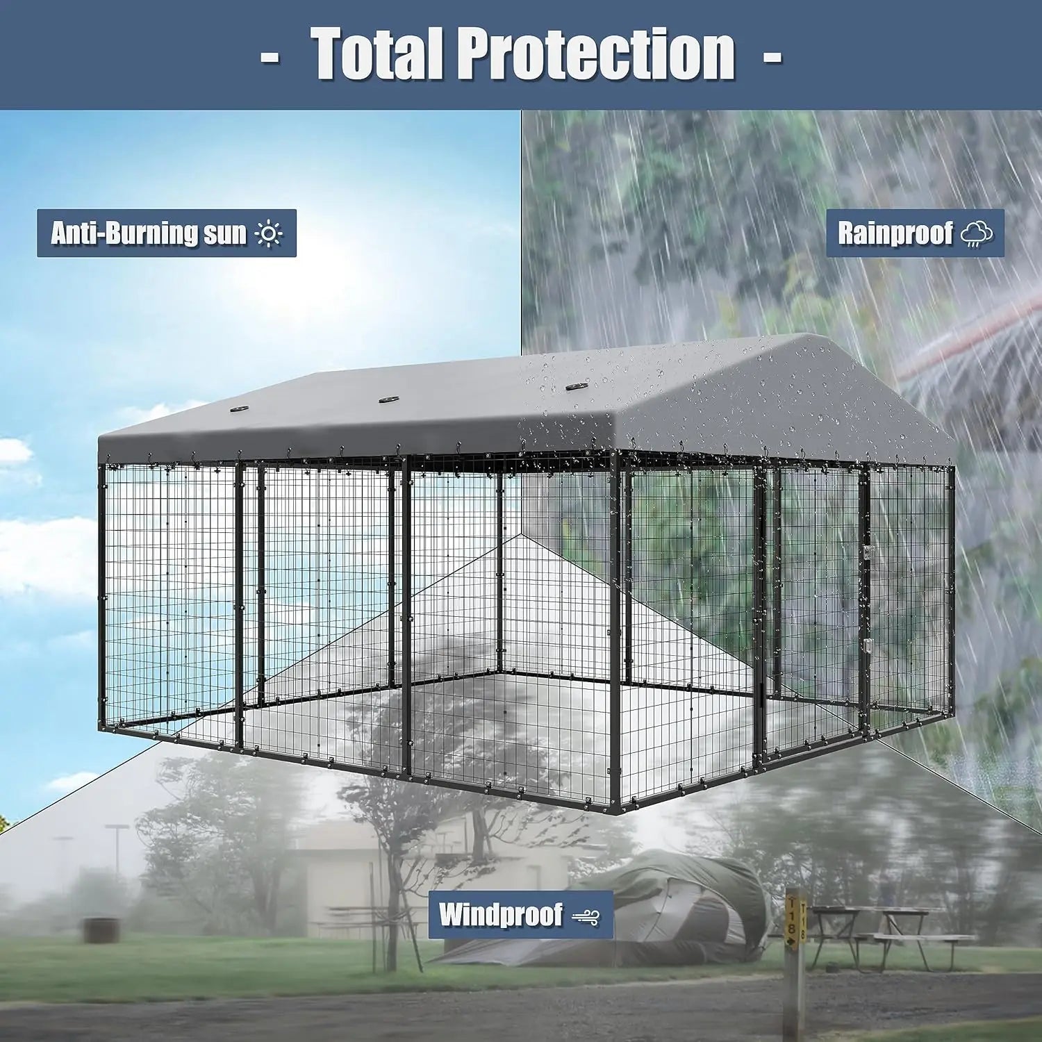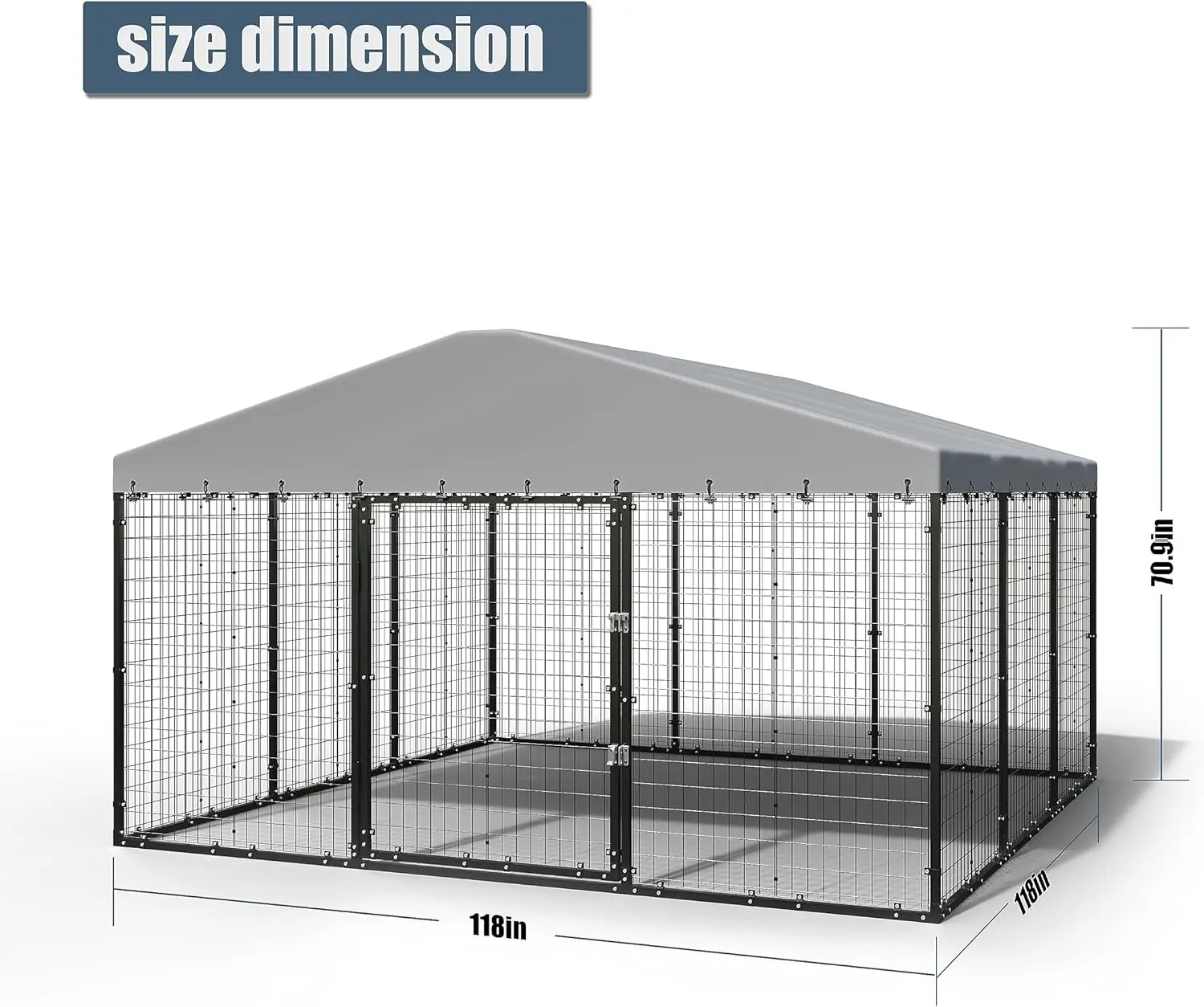 LARGE ENOUGH SPACE: The size of the dog kennel is 118in x 118in x 70.9in, which is enough to keep multiple large dogs. Dogs can run freely in the cage. The wire mesh used in the dog crate can well prevent your dog from rushing out of the crate.