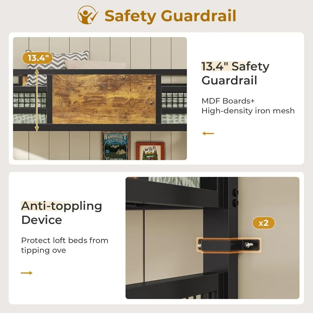 - 【Safety Guaranteed】-The top bed all around is guarded by full-length raised guardrails(MDF boards+ high-density iron mesh), which will prevent any faliing while tossing and turning. Also the anti-titlting Nails to securely fasten the bed to the wall for added safety. Create and maintaina safe place for you.