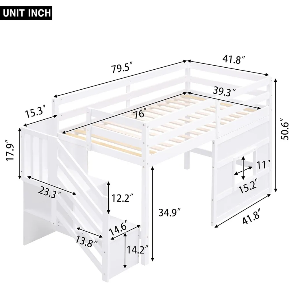 - 【Low Loft Bed with Storage Staircase】 Built-in Staircase instead of a ladder for easy access to the top bunk with 2 underneath storage space can effectively space space and is suitable for space-saving lover. 2-Step sturdy Stairs for Easy Access, Generous 15-inch safety guard rails. This bed featuring a window, this unique bed creates a fun and adorable space that not only serves as a comfortable sleeping area but also double as a space to play and have fun.
