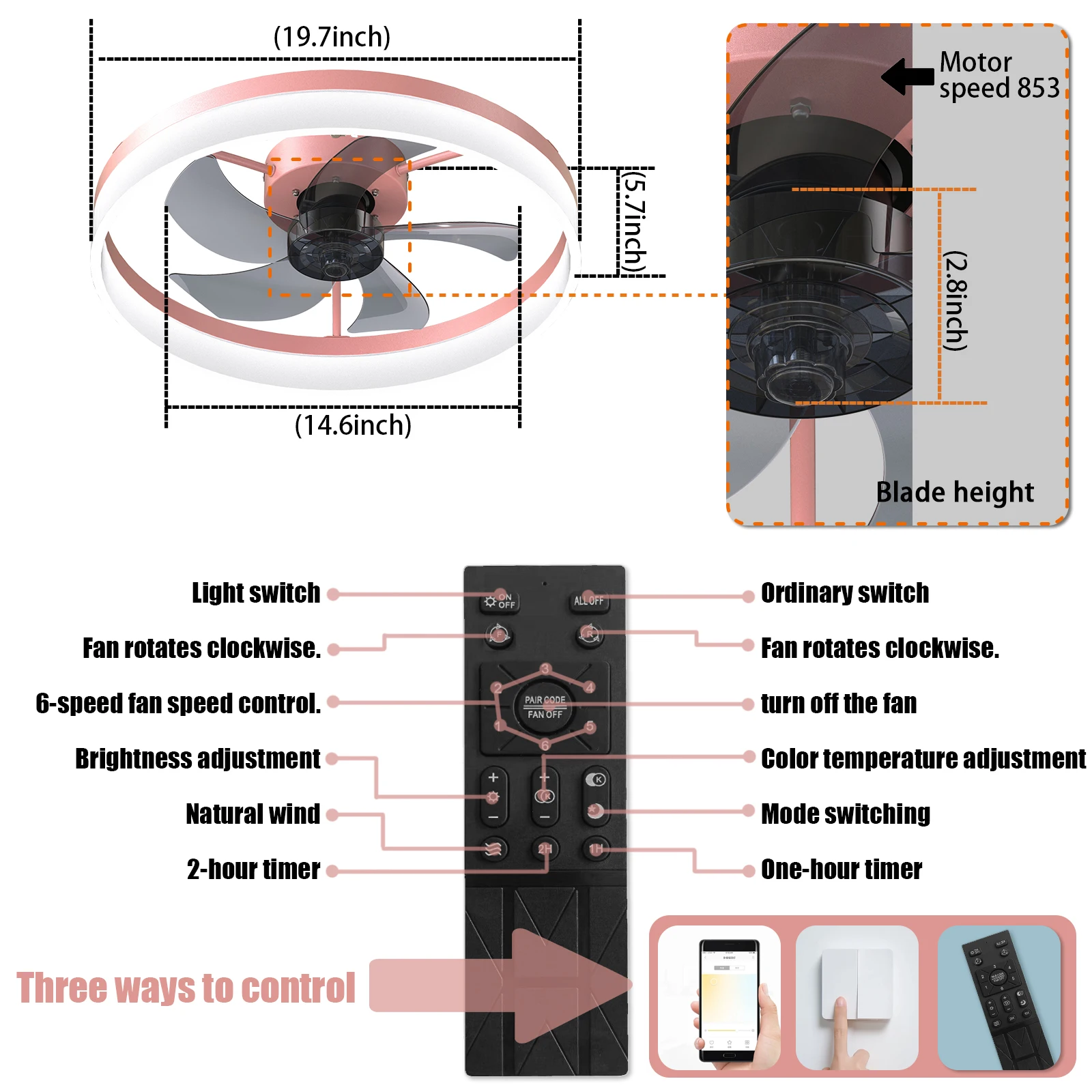 Modern Ceiling Fan with LED Light, Low-Profile Flush Mount,6-Speed Adjustable, Ideal for Bedroom and Living Room (Pink)