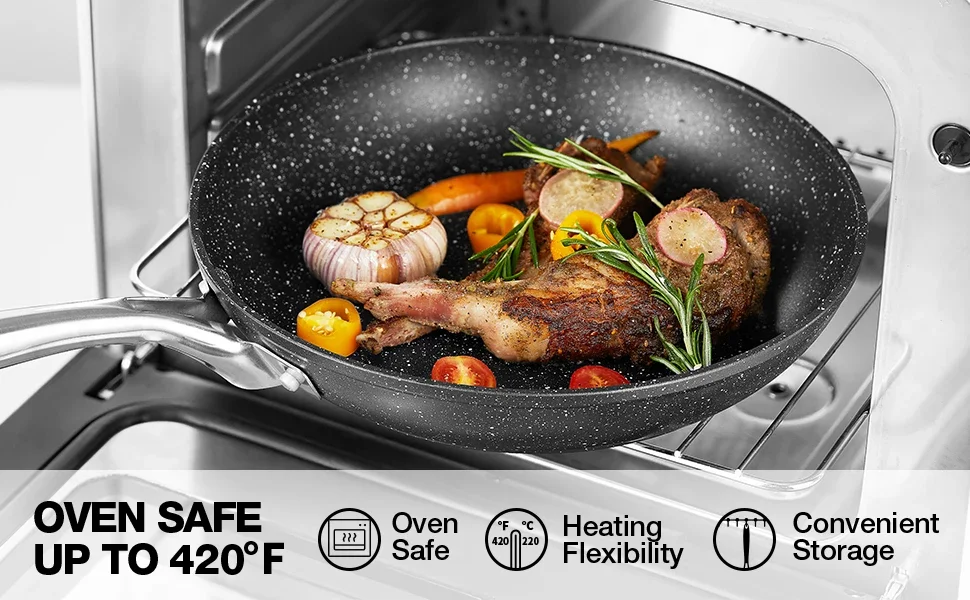 Durable Non-stick CoatingThe natural non-stick marble coating is free of PFOA, PFOS, lead & cadmium for a healthier and more convenient cooking experience everyday. |