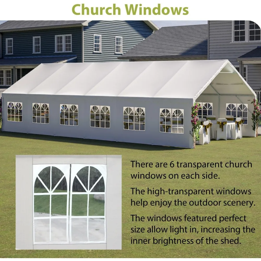 【Extra Large Size & Heay Duty Tent】: The DetalleGo party tent dimensions are: 471.2"L x 239.3"W x 130"H. The wedding canopy tent can hold up to an estimated 85 people for dining or party, The extra large size allows you to easily hold weddings and various parties without worrying about insufficient space.