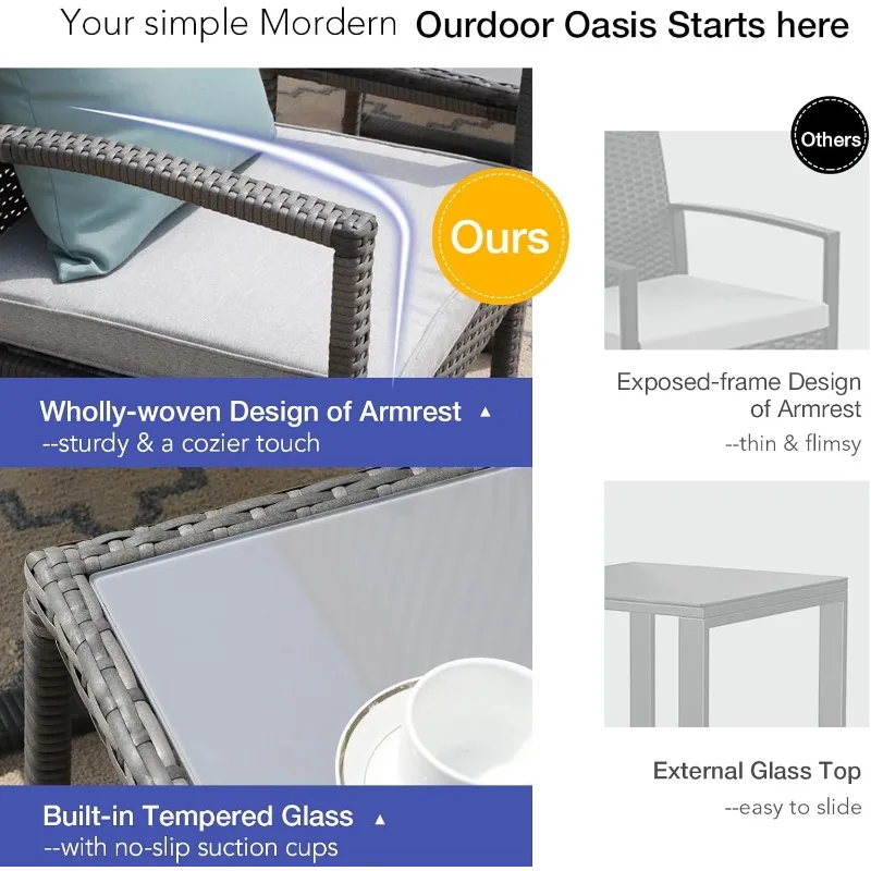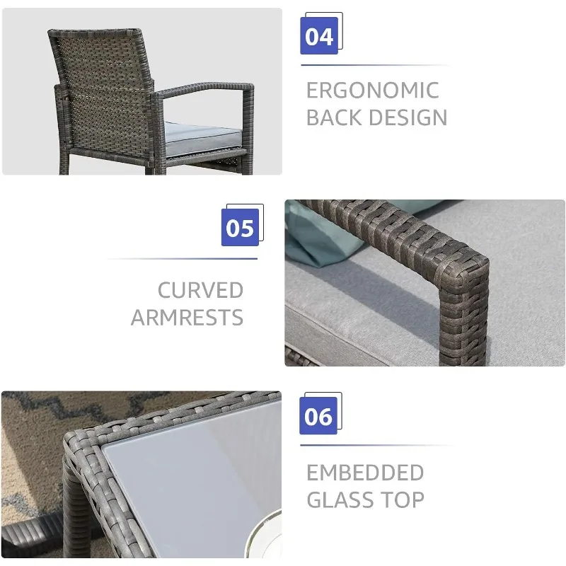- ๐น[Upgraded Comfort]: The comfortable and breathable cushions offer the optimal comfort and is removable and washable. The rattan couch features a grey tempered glass top that is easy to remove and clean, a great decoration to outdoor space, perfect for you to place drinks, meals, or snacks on top.