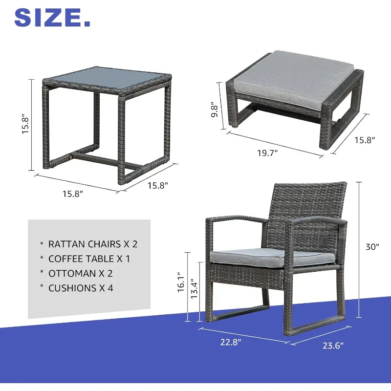 - ๐น[ Charming Furniture Set]: This 5 Piece Furniture Set comes with 2 armchairs, 1 coffee table with 1 tempered glass, 2 ottoman, 2 seat cushions and 2 ottoman cushions. The built-in design of glass table top with non-slip suction cups looks beautiful, perfect for you to place drinks, meals, or snacks on top. You can enjoy the leisure time with someone you love for ultimate comfort and relaxation.