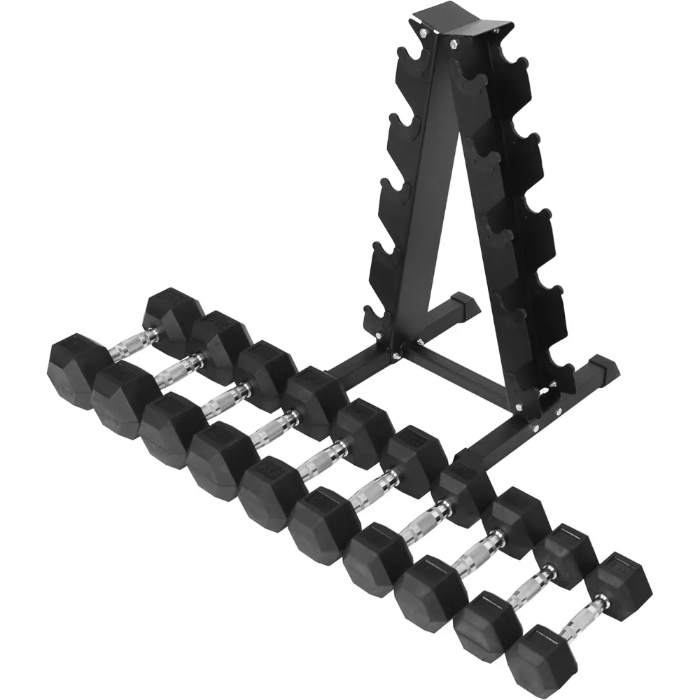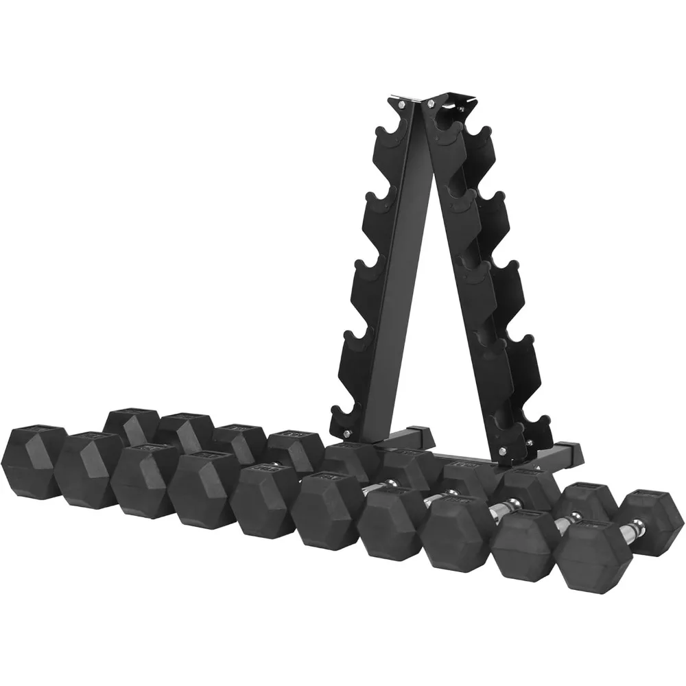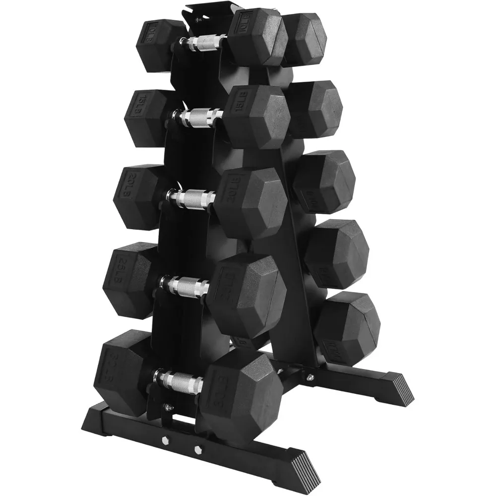 - 200 pounds set: 1x A-Frame rack (5-tier), pair of 10lbs, 15lbs, 20lbs, 25lbs and 30lbs