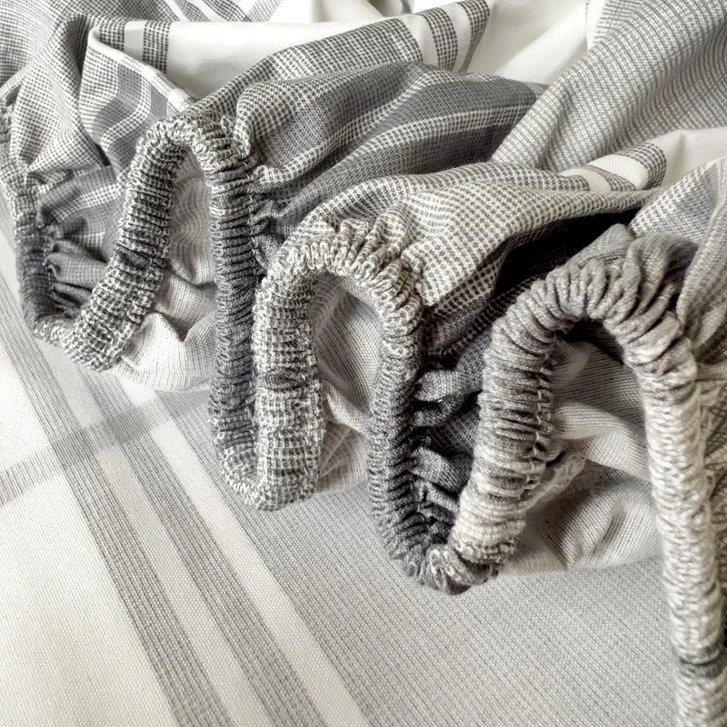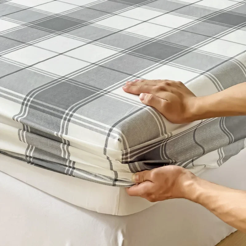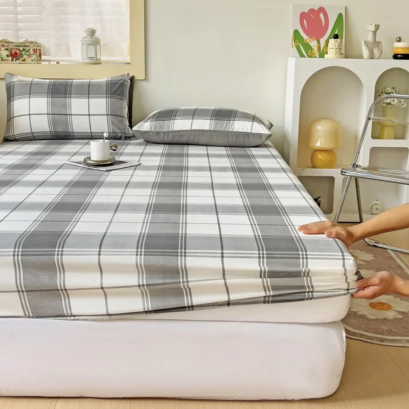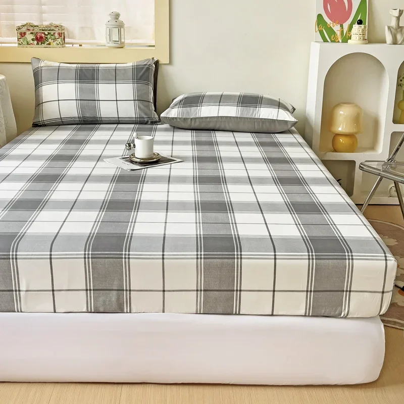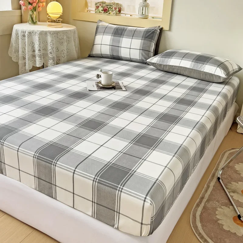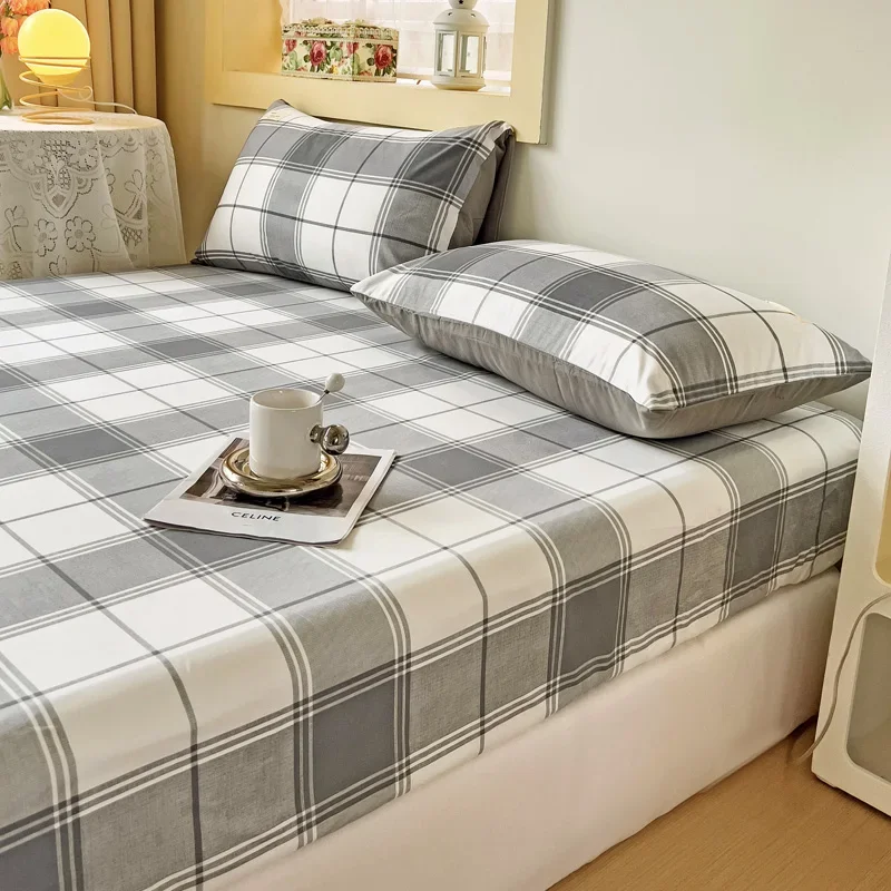 Simple Gray Checkered Fitted Sheet Set 3Pcs Geometric Plaid Non-slip Elastic Bed Cover with 2 Pillowcases Home Bedding Set