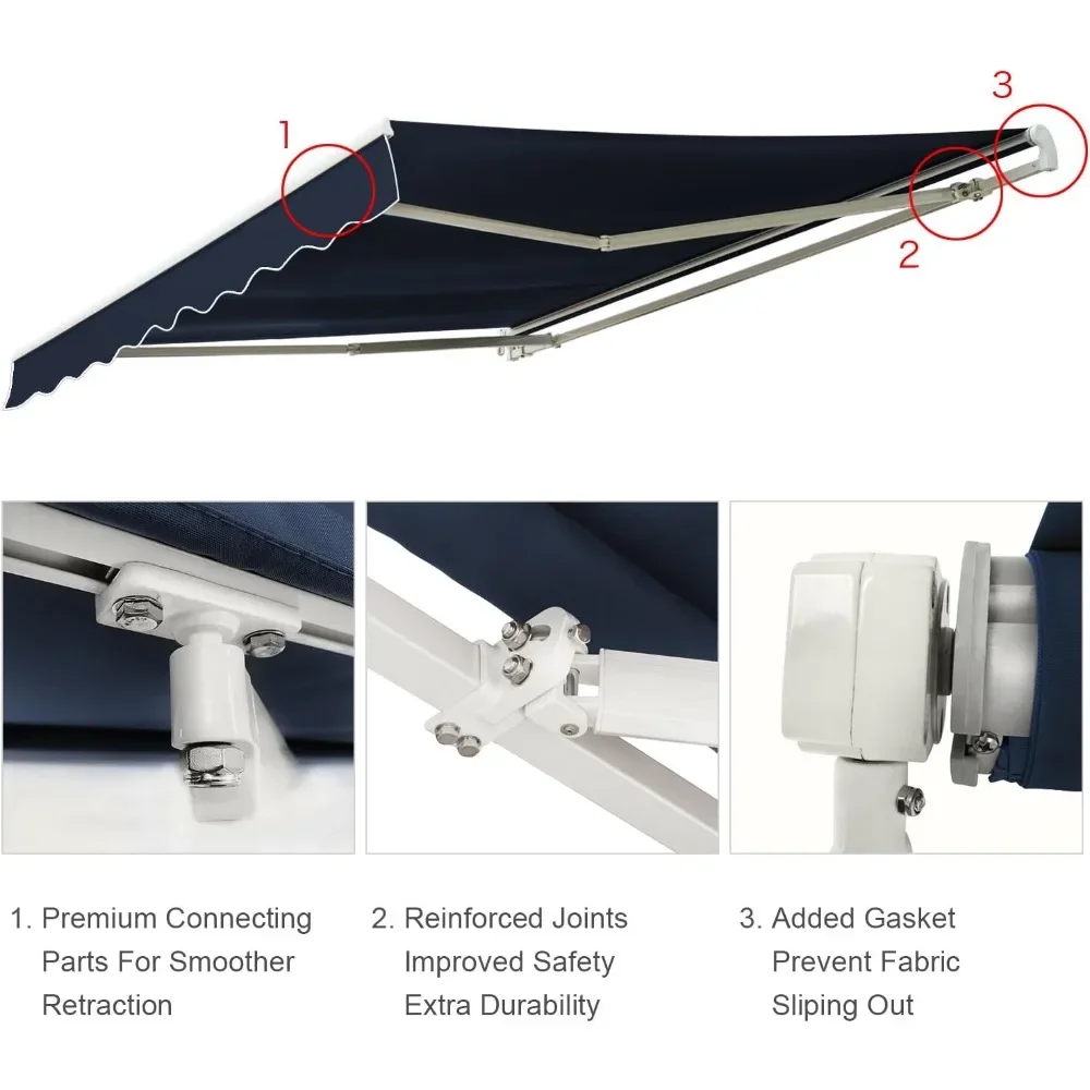 - 12' by 8' HIGH-QUALITY STANDARD: 12feet long 8feet width Awning Backed with a 1 years warranty and certified CE, GS, and RoHS, this awning is built and tested to be simple to use and durable to last. Residential and commercial use. Most accurate fully extend product dimension: 11.32'x8.20'.