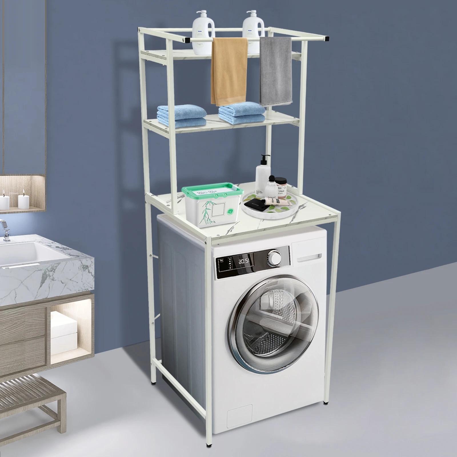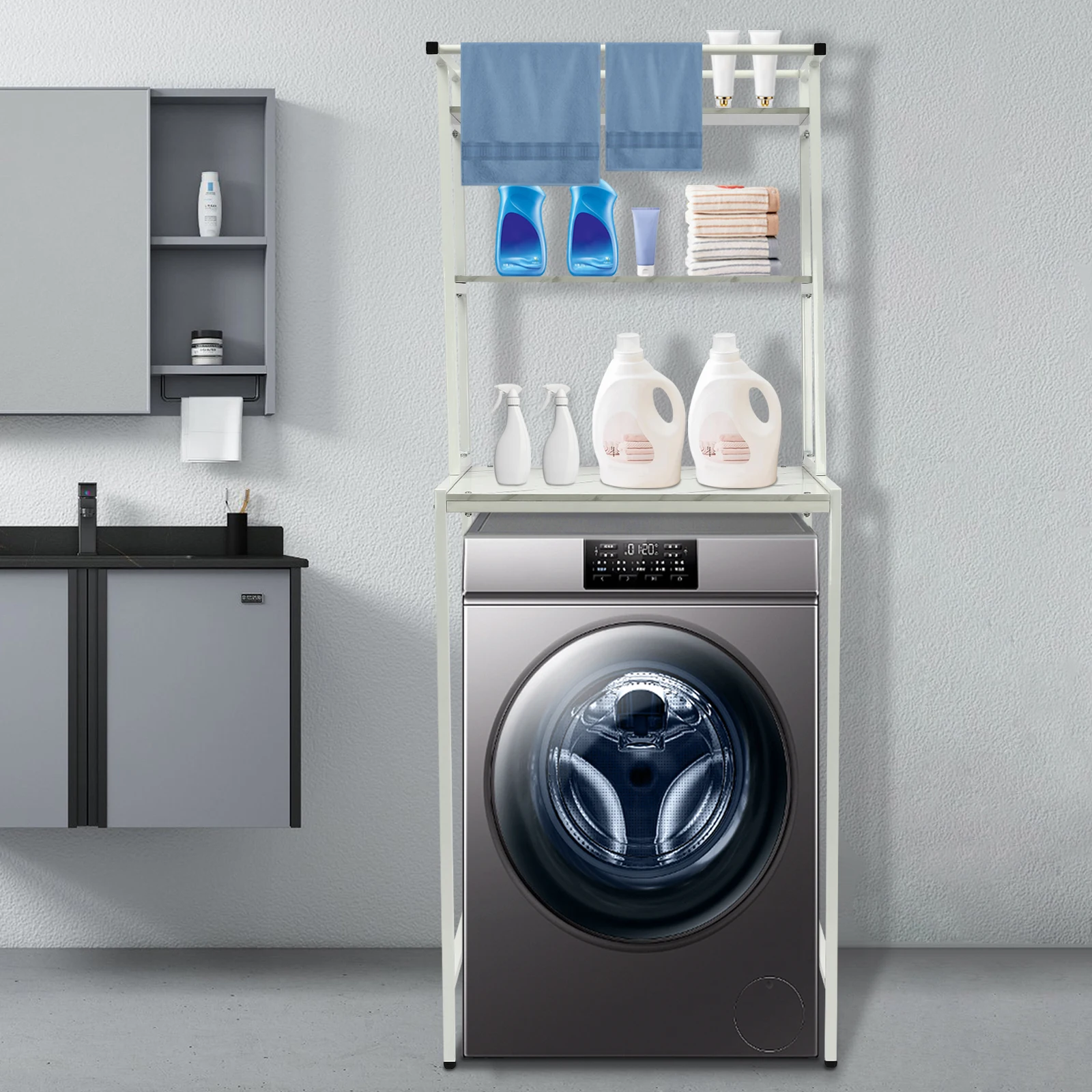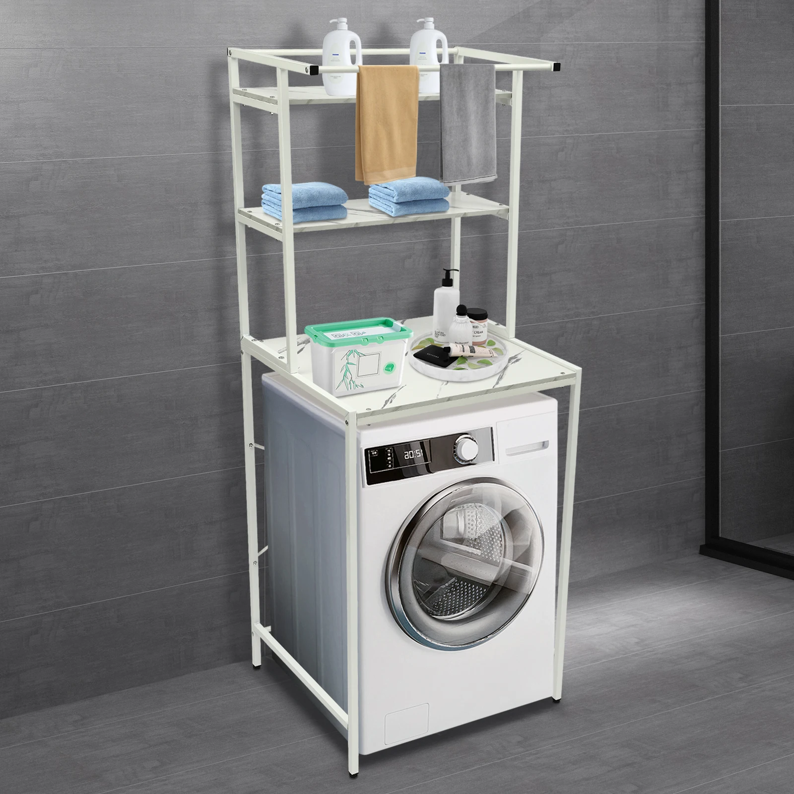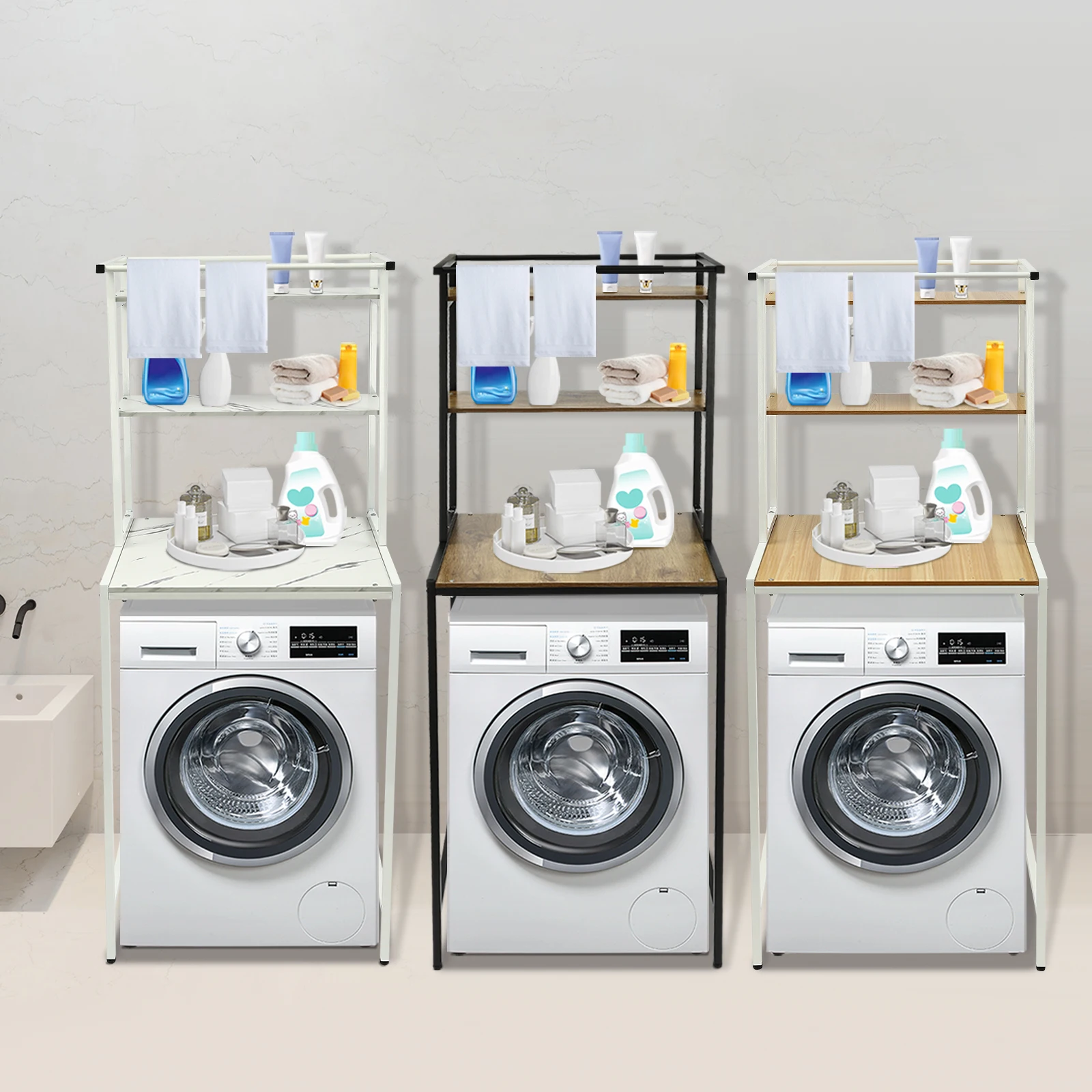 Ample Storage Space: It will be neater and cleaner for you because the three-tier design can store small storage baskets, flower pots, skin care products, cosmetics, and cleaning supplies and the large compartment at the bottom is for putting your washer. The top crossbar design is for hanging towels, clothesline, and other items.