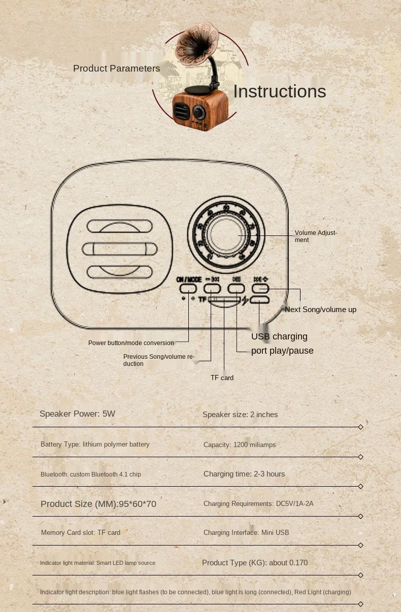Wireless Bluetooth Speaker Plug Card Home Charging Small Stereo Retro Vintage Gramophone Shape Portable USB Interface Travel