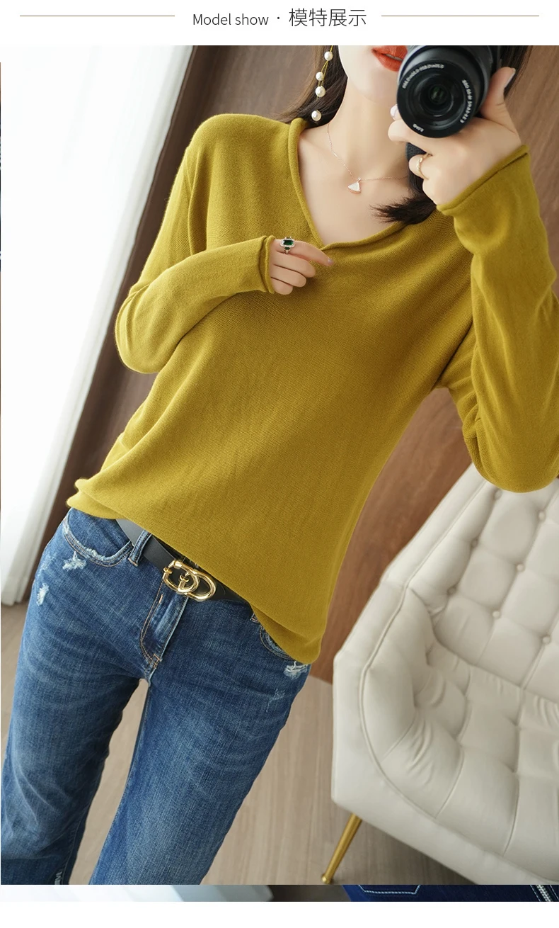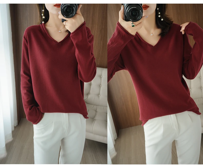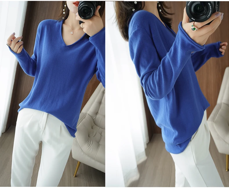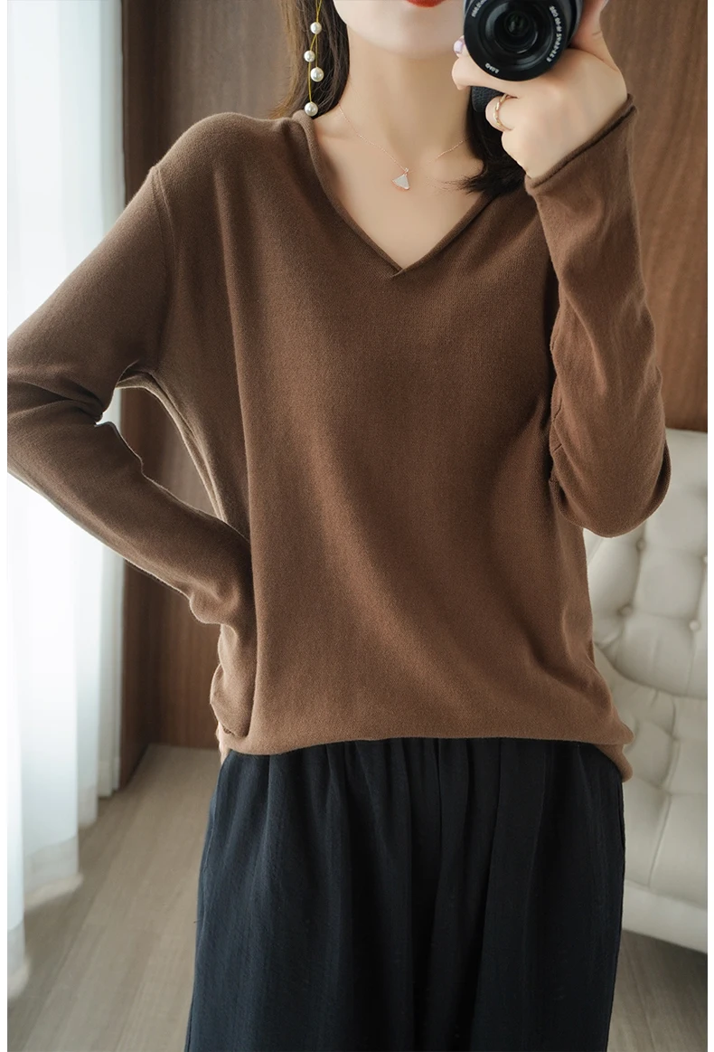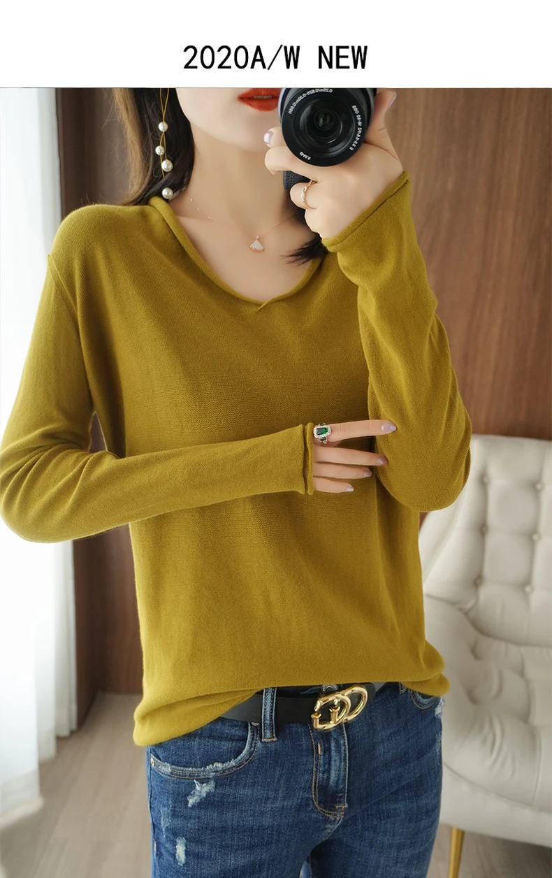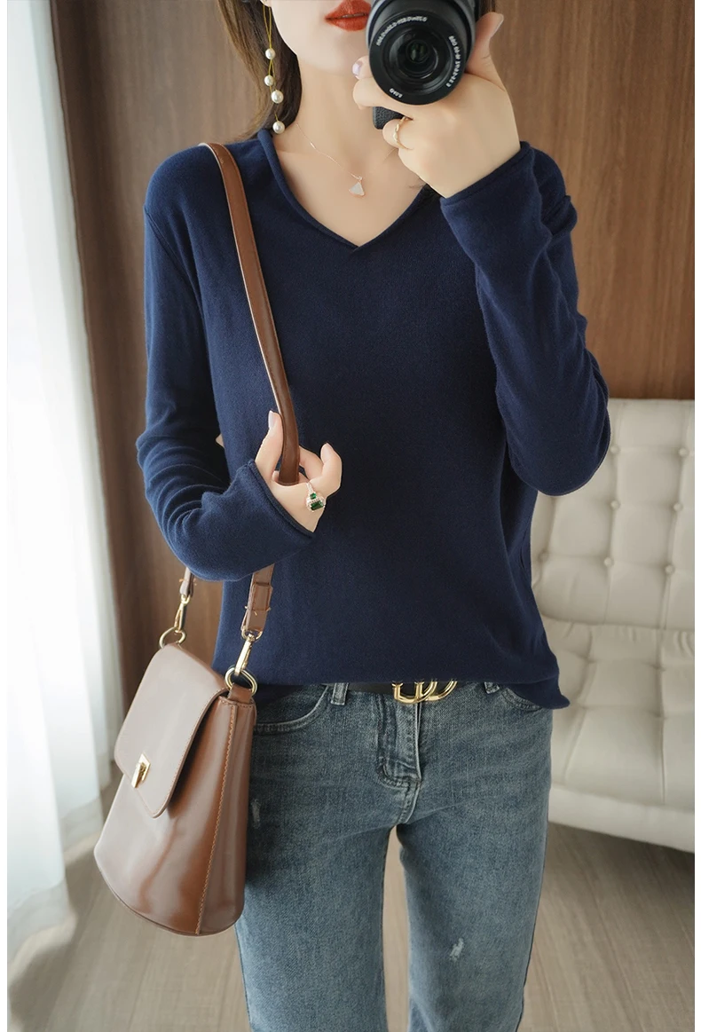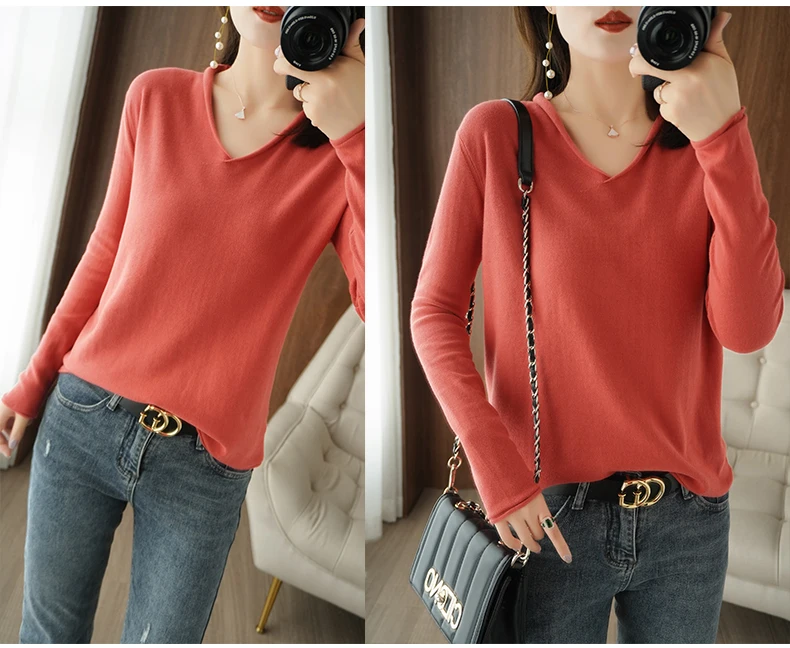 Women Curled V-Neck Pullover With Hat 100% Cotton Sweater Autumn Winter Knit Clothing Soft Bottoming Long Sleeve Solid Tops
