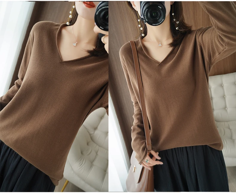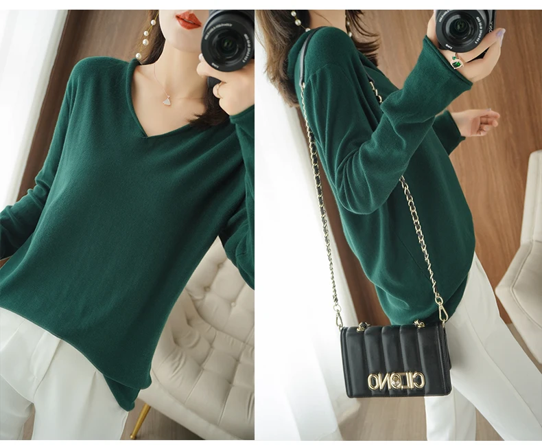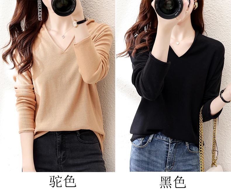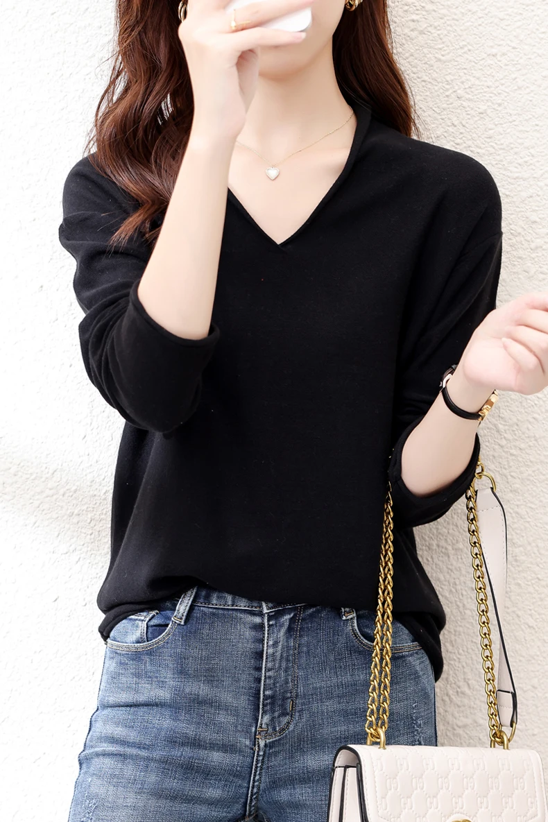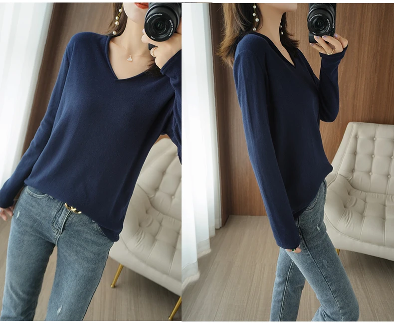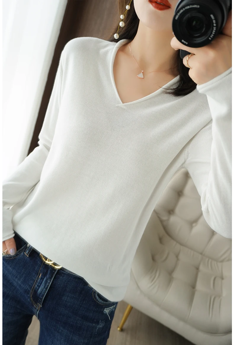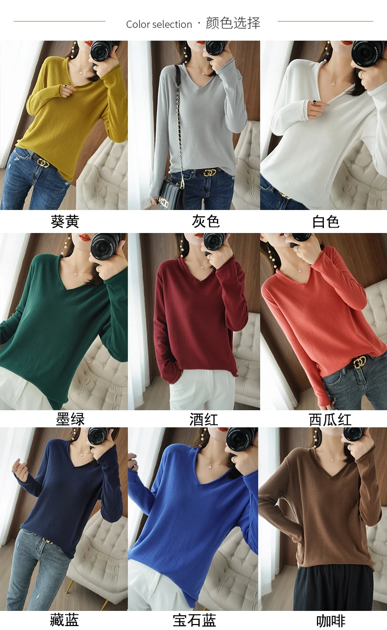 Women Curled V-Neck Pullover With Hat 100% Cotton Sweater Autumn Winter Knit Clothing Soft Bottoming Long Sleeve Solid Tops
