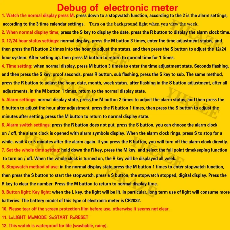 --Multifunction Watch: stopwatch, alarm clock, hourly reminder, luminous, date display, time display, week display, 12/24 hour conversion, waterproof
